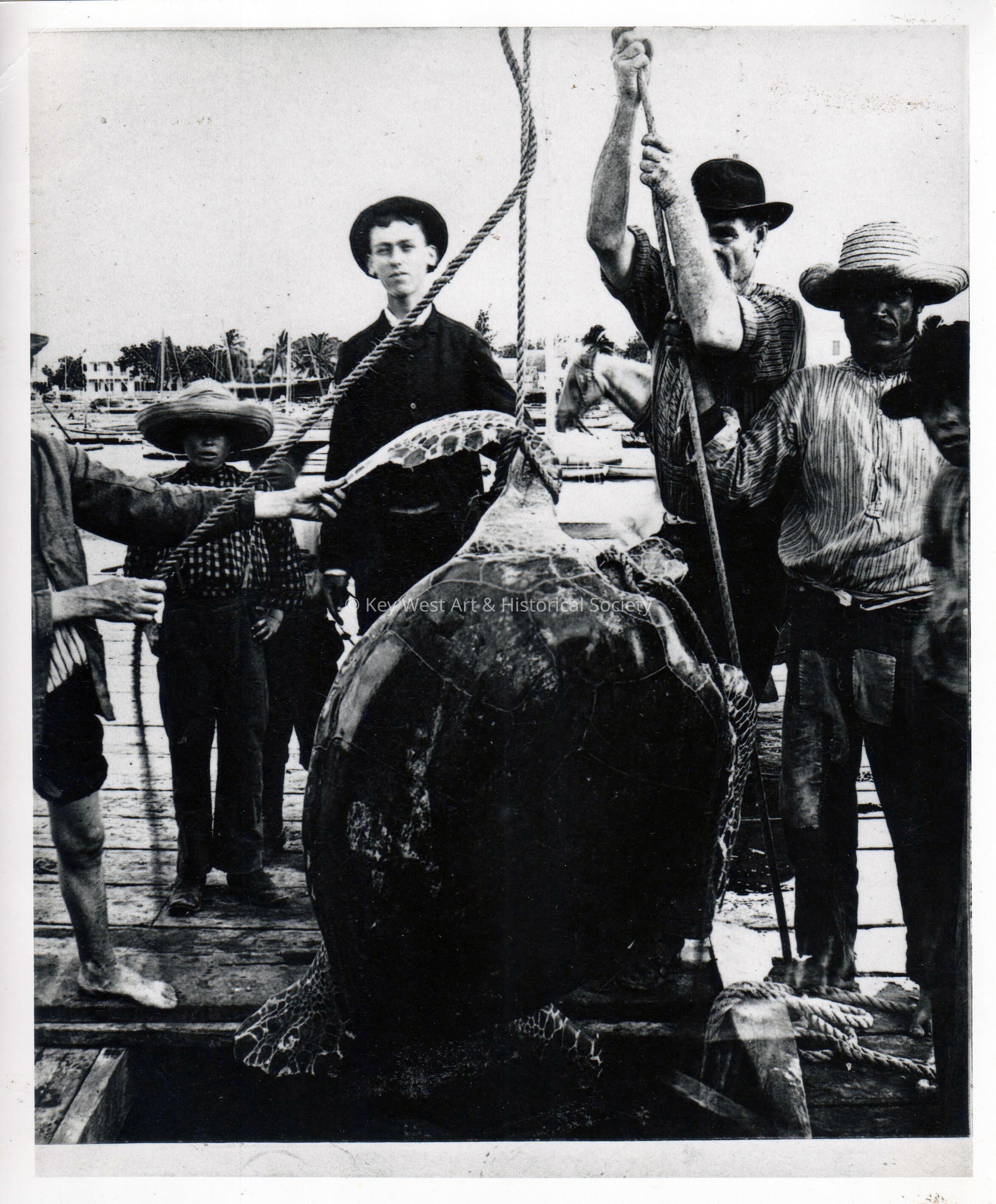 Black and white photograph of men hoisting up a large green turtle on an unknown dock.