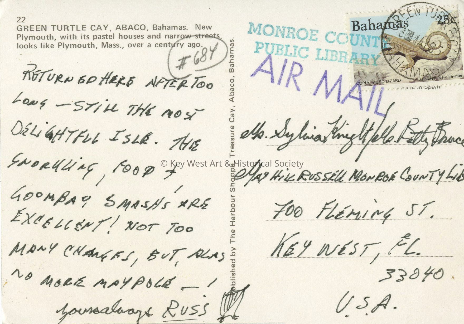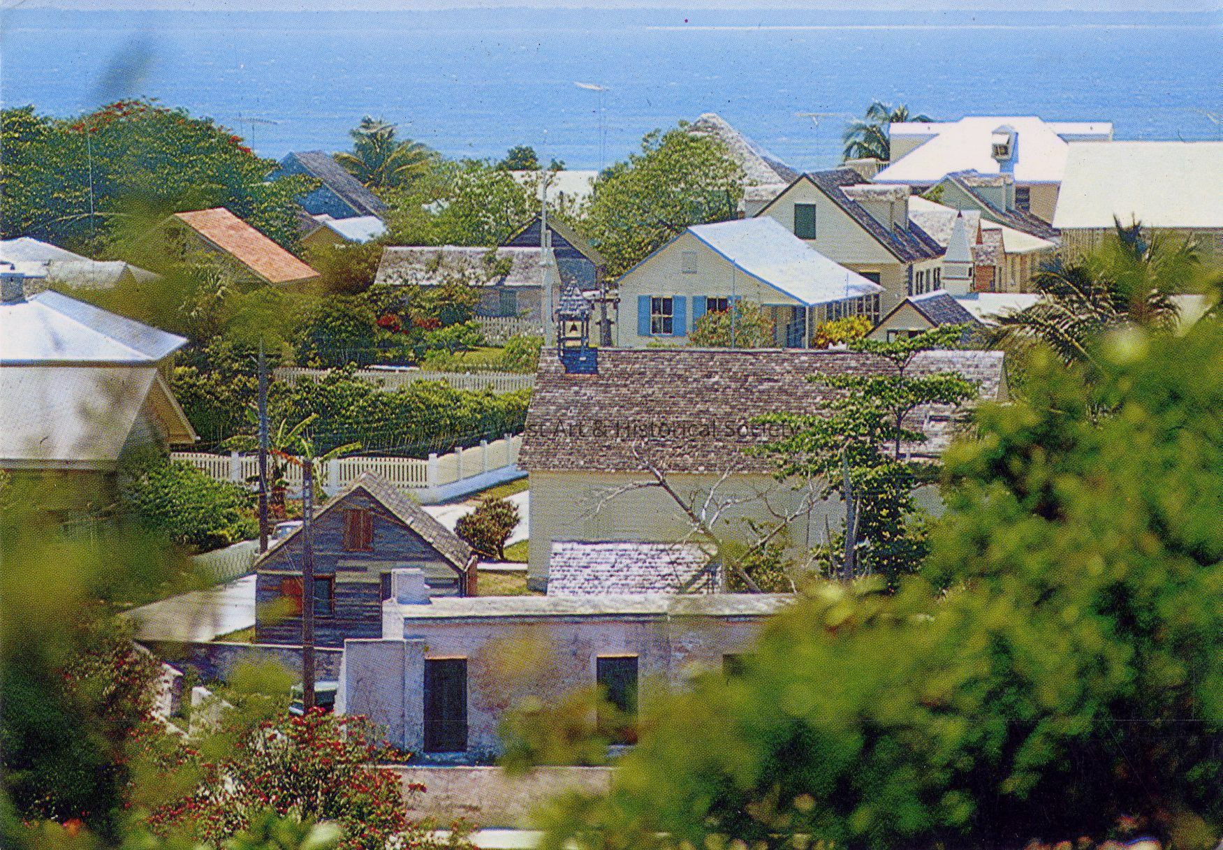 Postcard depicting New Plymouth, Green Turtle Cay, Abaco, The Bahamas. Notation on verso, 'New Plymouth, with its pastel houses and narrow streets, looks like Plymouth, Mass., over a century ago.'Subject Place