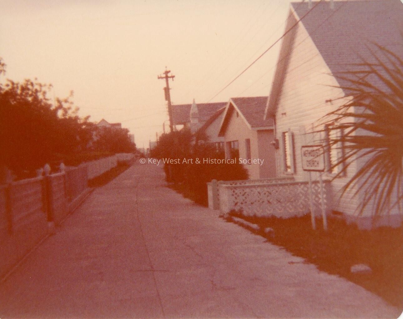 Color photograph of an unknown street with Methodist Church, possible New Plymouth, Green Turtle Cay, Bahamas.Collection