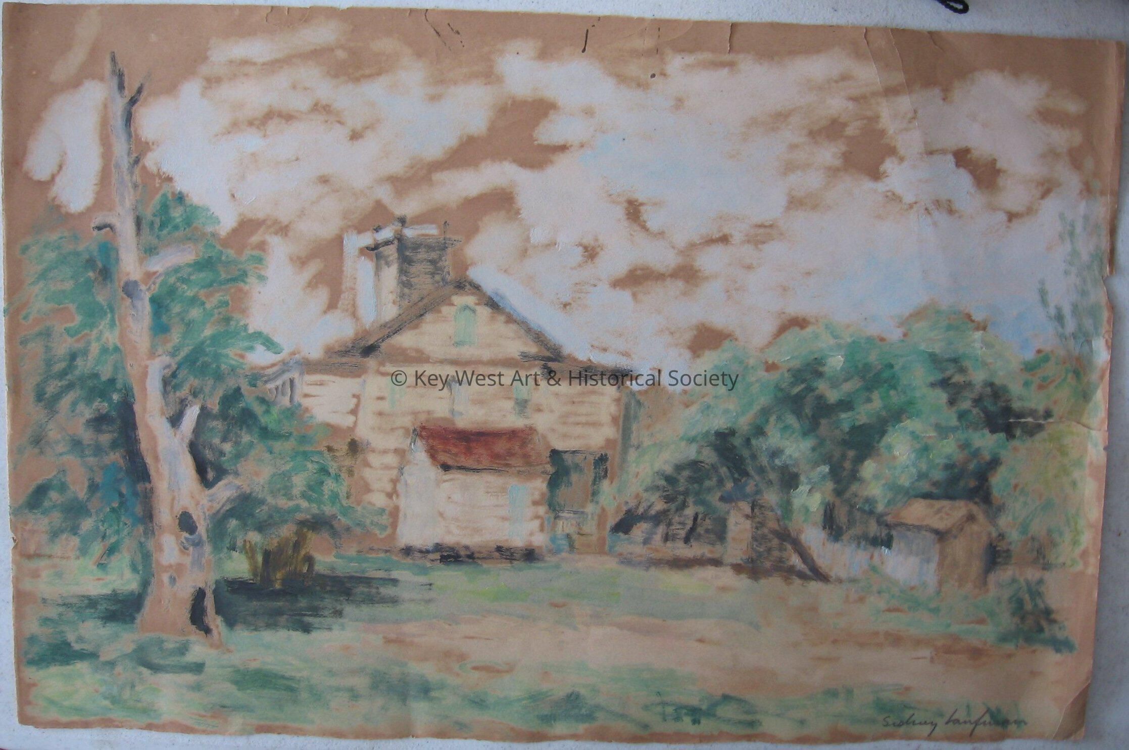 Watercolor painting on brown paper by Sidney Laufman depicting a log cabin surrounded by trees.Collection