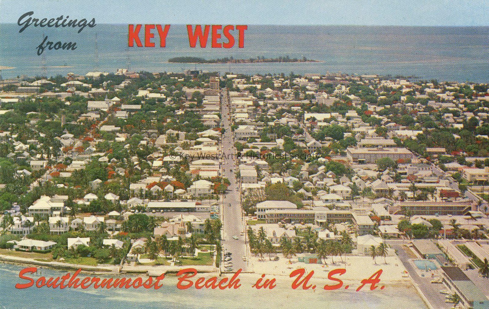 Postcard depicting an aerial view of Key West taken from the Atlantic end of Duval Street. Notation on verso, 'Airview of Key West, Florida showing the famous Duval Street, longest shortest street connecting the Gulf of Mexico with the Atlantic Ocean.'Subject Place