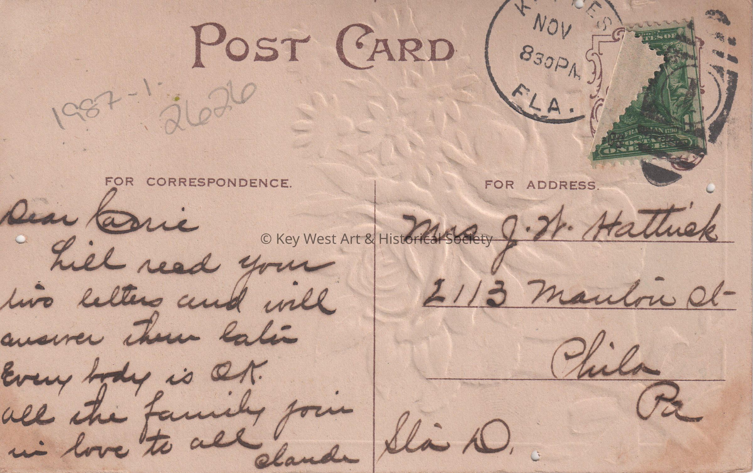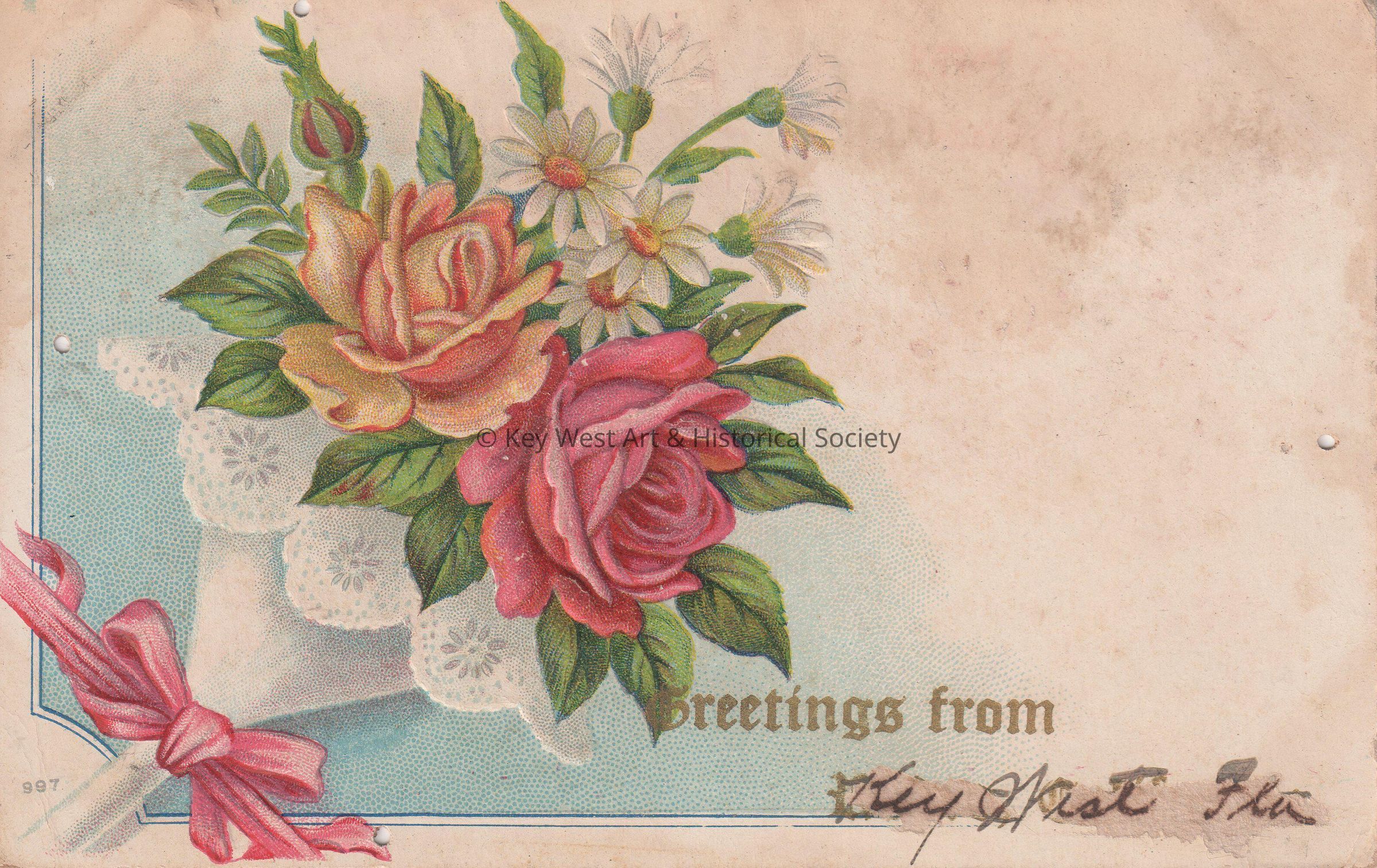 Postcard depicting a bouquet of flowers. The caption reads, ‘Greetings from Key West, Florida.’ The message on the verso reads, ‘Dear Carrie, Will read your two letters and will answer them later. Everybody is ok. All the family join in love to all. Claude.’ The card is addressed to Mrs. J. W. Hattrick, 2113 Manton Street, Philadelphia, Pennsylvania, Station D, and is postmarked Key West, November.Collection