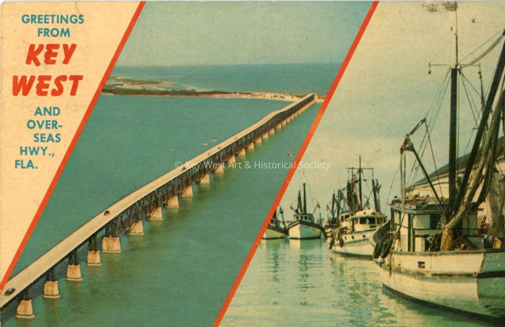 Postcard depicting scenes from Key West and the Overseas Highway, Florida. "Picture at left: Famous Bahia- Honda Bridge on the Overseas Highway (U.S. One ). It runs the full length of the Florida Keys starting from the mainland south of Homestead. Picture at right: Shrimp fleet at Key West."Collection