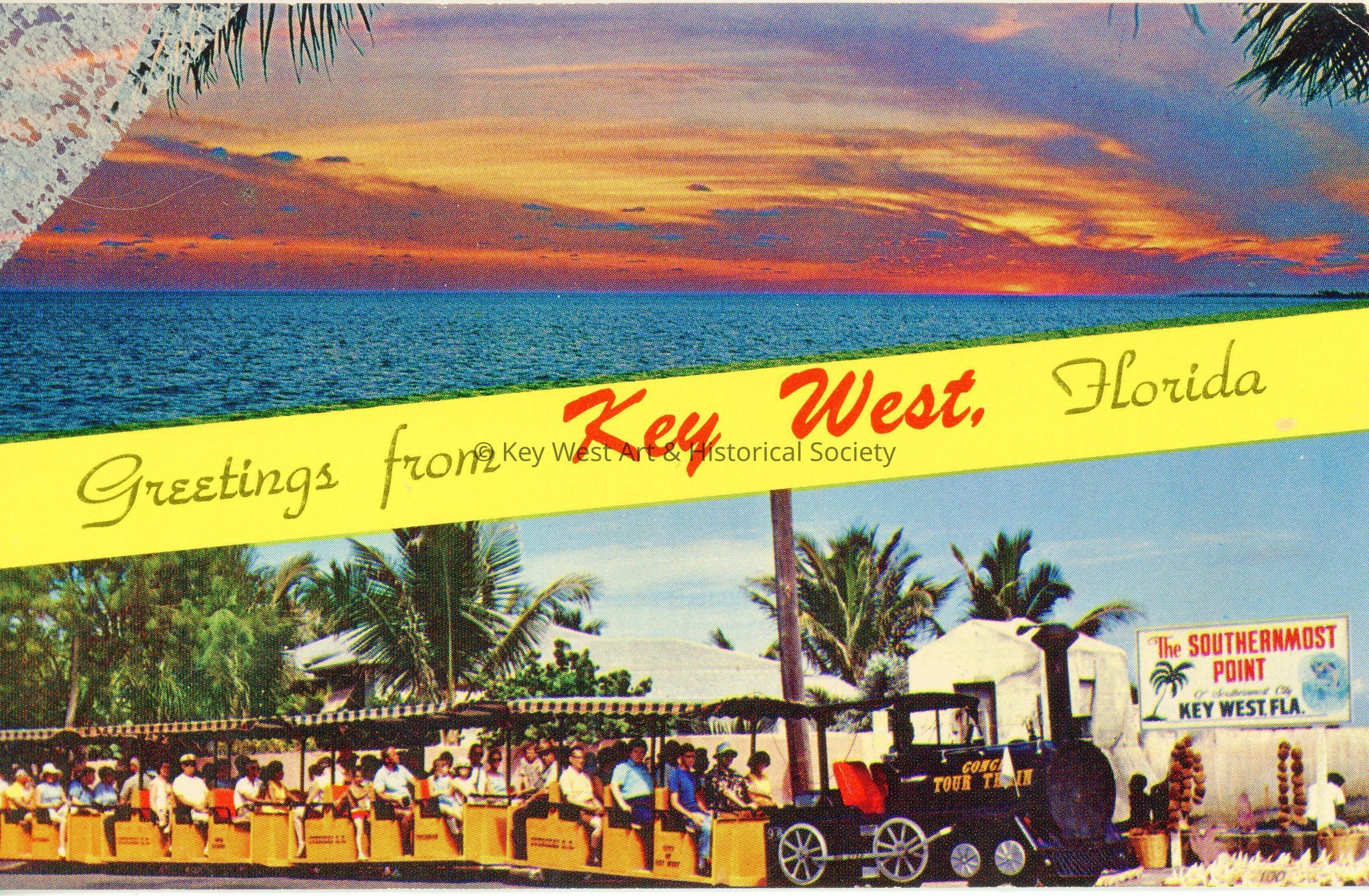 Postcard depicting a Key West sunrise on top and the Conch Tour Train passing the Southernmost Point, Cable Hut and sponge sellers on the bottom. Notation on verso, 'Top View: Brilliant Sunrise in Key West. Bottom View: Conch Tour Train at southernmost point.'Subject Place