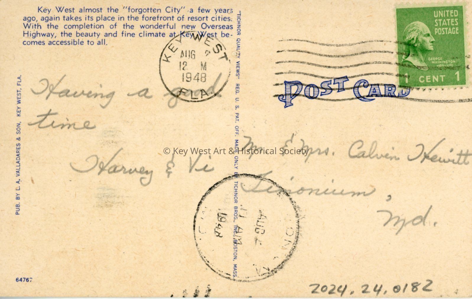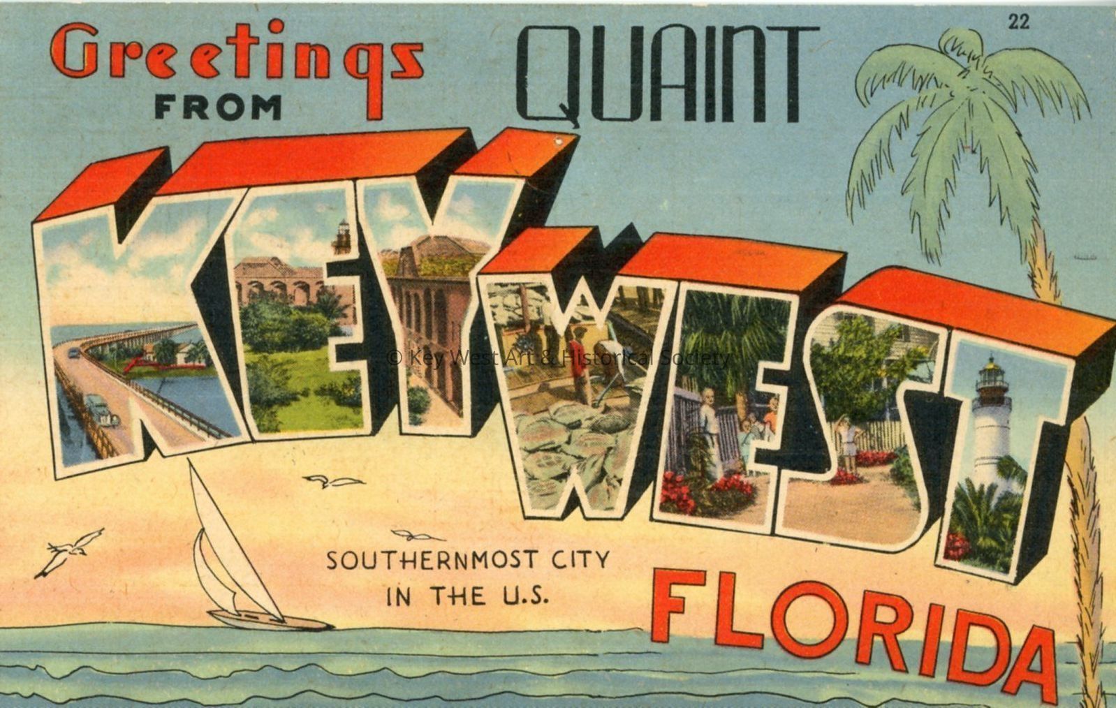 Postcard depicting "GREETINGS FROM QUAINT KEY WEST, FLORIDA." Key West almost the "forgotten city" a few years ago, again takes its place in the forefront of resort cities. With the completion of the wonderful new Overseas Highway, the beauty and fine climate at Key West becomes accessible to all."Collection