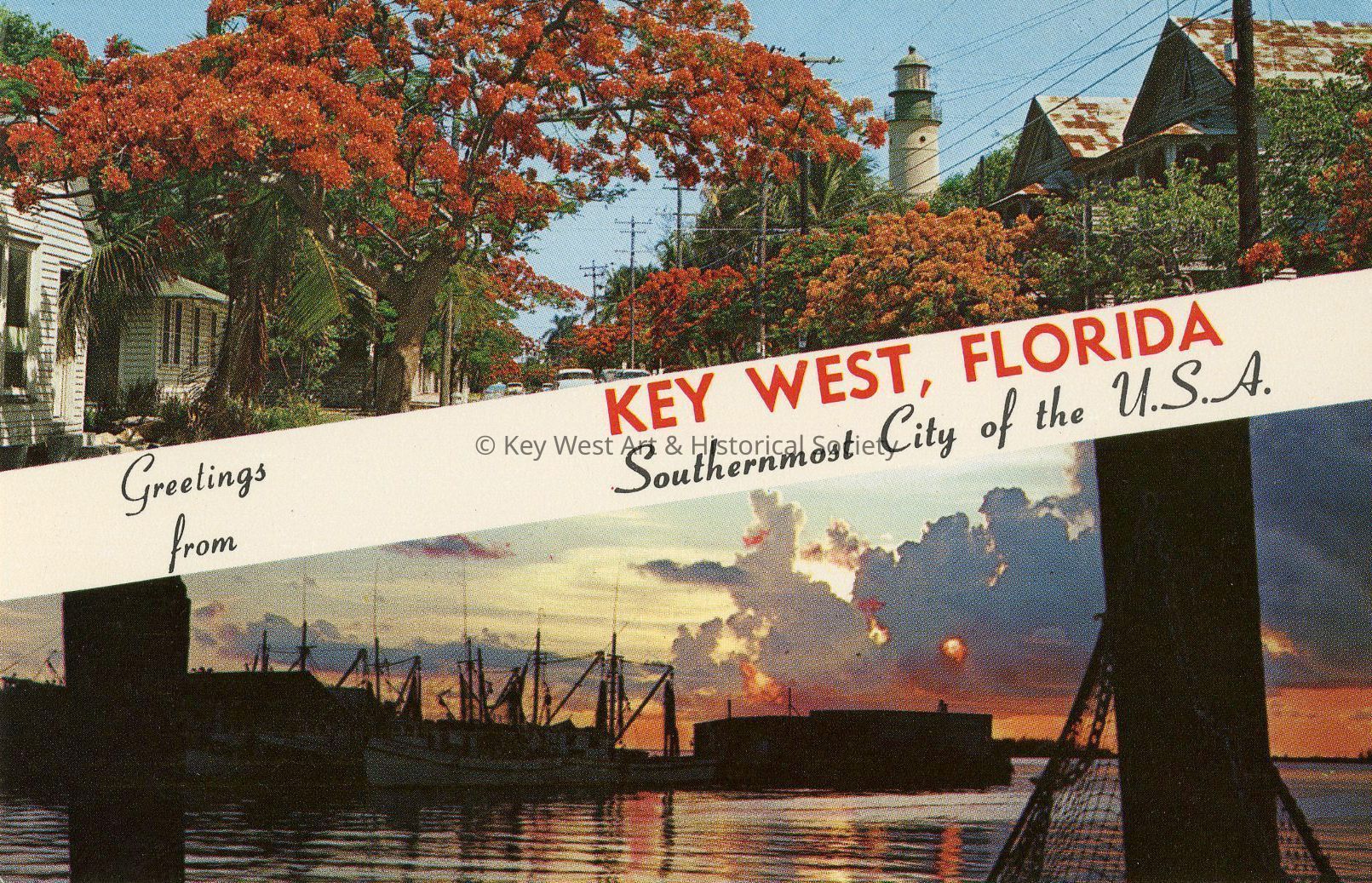 Postcard depicting two views of Key West including Whitehead Street and the Key West Lighthouse on top and the Key West Bight at sunset on the bottom. Notation on verso, 'Beautiful Royal Poinciana Trees lined along the streets and Picturesque Shrimp Boats nestling snugly in the harbor are contrasting but typical scenes of Key West, Florida.'Subject Place
