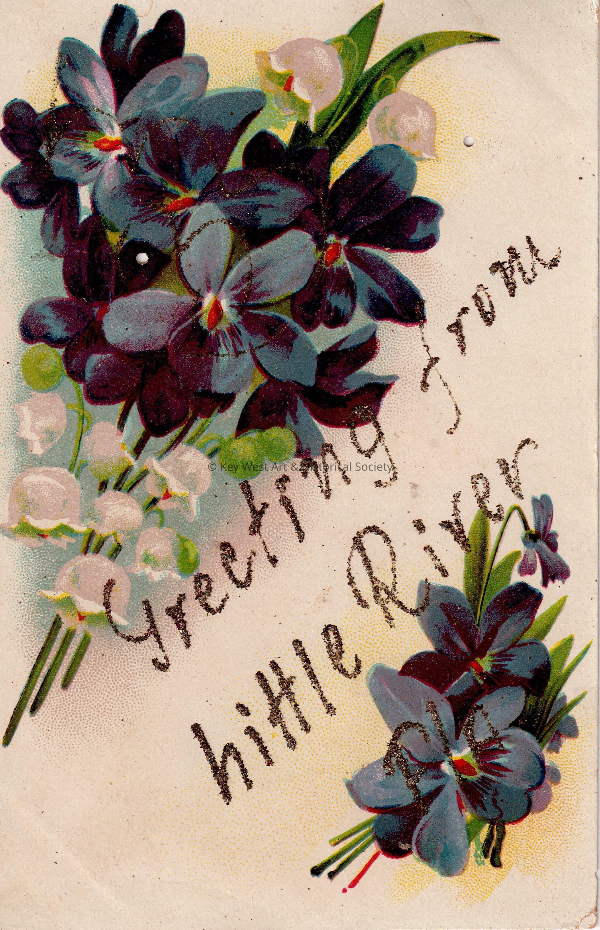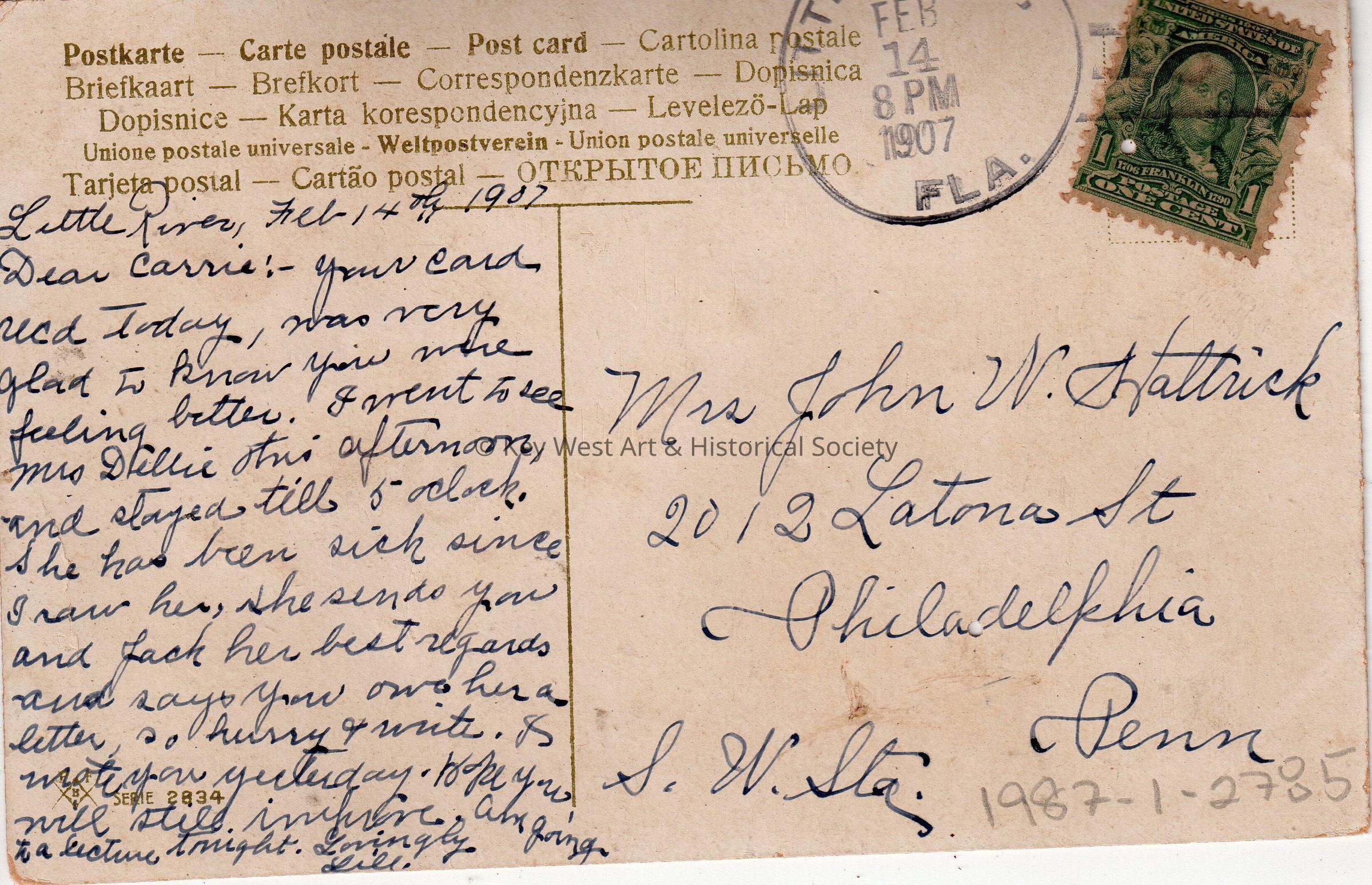 Postcard depicting flowers. The caption reads, ‘Greetings from Little River, Florida.’ The message on the verso reads, ‘Little River, February 14th, 1907, Dear Carrie: Your card received today, was very glad to know you were feeling better. I went to see Mrs. Dillie this afternoon, and stayed till 5 o’clock. She has been sick since I saw her. She sends you and Jack her best regards and says you owe her a letter, so hurry & write. I wrote you yesterday. Hope you will still improve. Am going to a lecture tonight. Lovingly Lill.’ The card is addressed to Mrs. John W. Hattrick, 2012 Latona Street, Philadelphia, Pennsylvania, Southwest Station, and is postmarked Little River, February 14, 1907.Collection