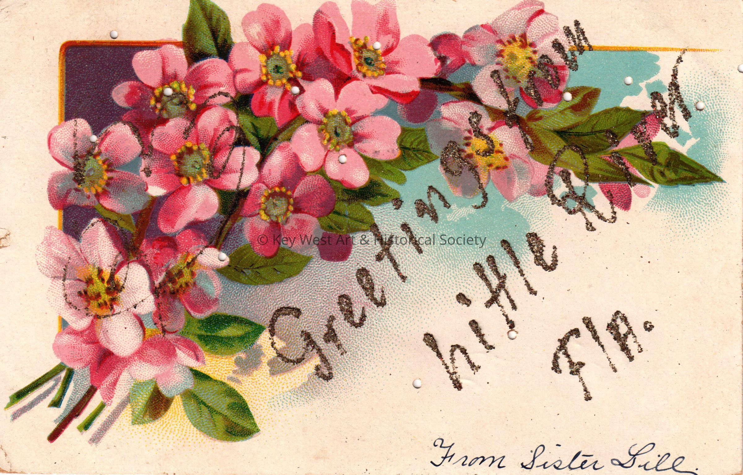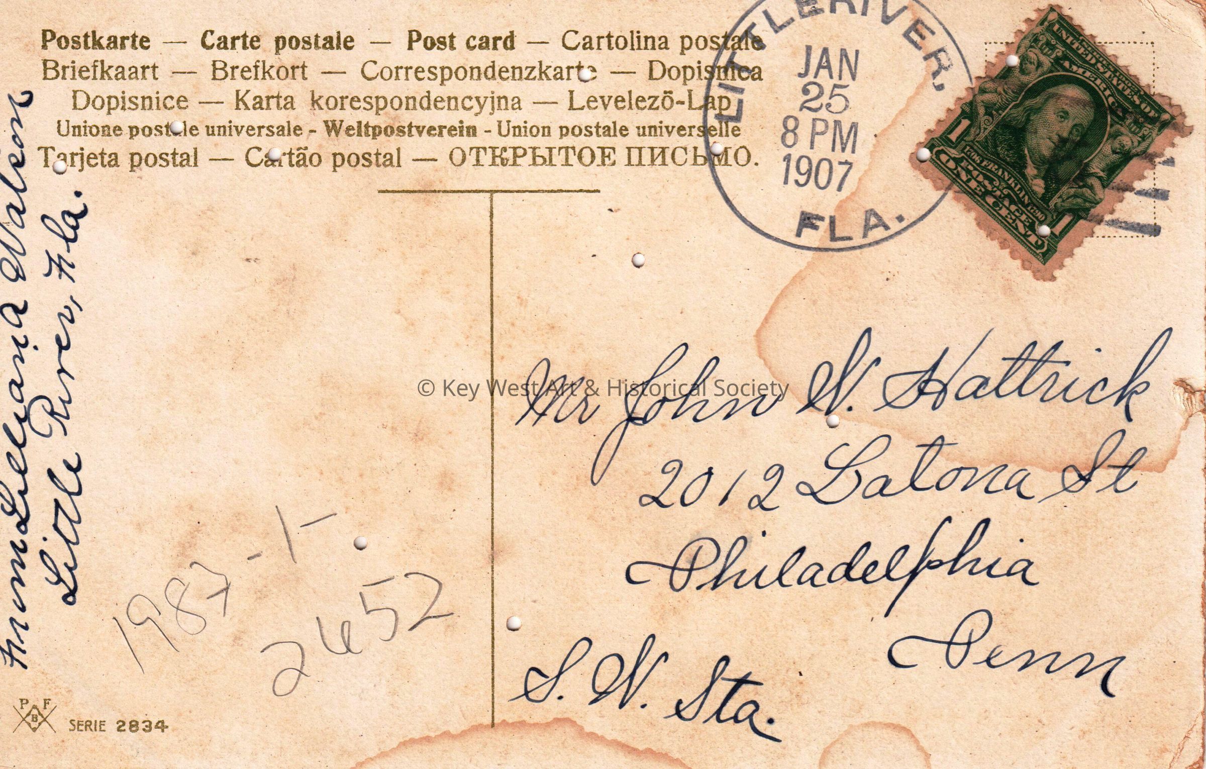 Postcard depicting flowers. The caption reads, ‘Greetings from Little River, Florida’. The message on the front reads, ‘From Sister Lill’. The message on verso reads, ‘From Lillian A. Watson, Little River, Florida’. The card is addressed to Mr. John W. Hattrick, 2012 Latona Street, Southwest Station, Philadelphia, Pennsylvania, and is postmarked Little River, Florida, January 25, 1907.Collection