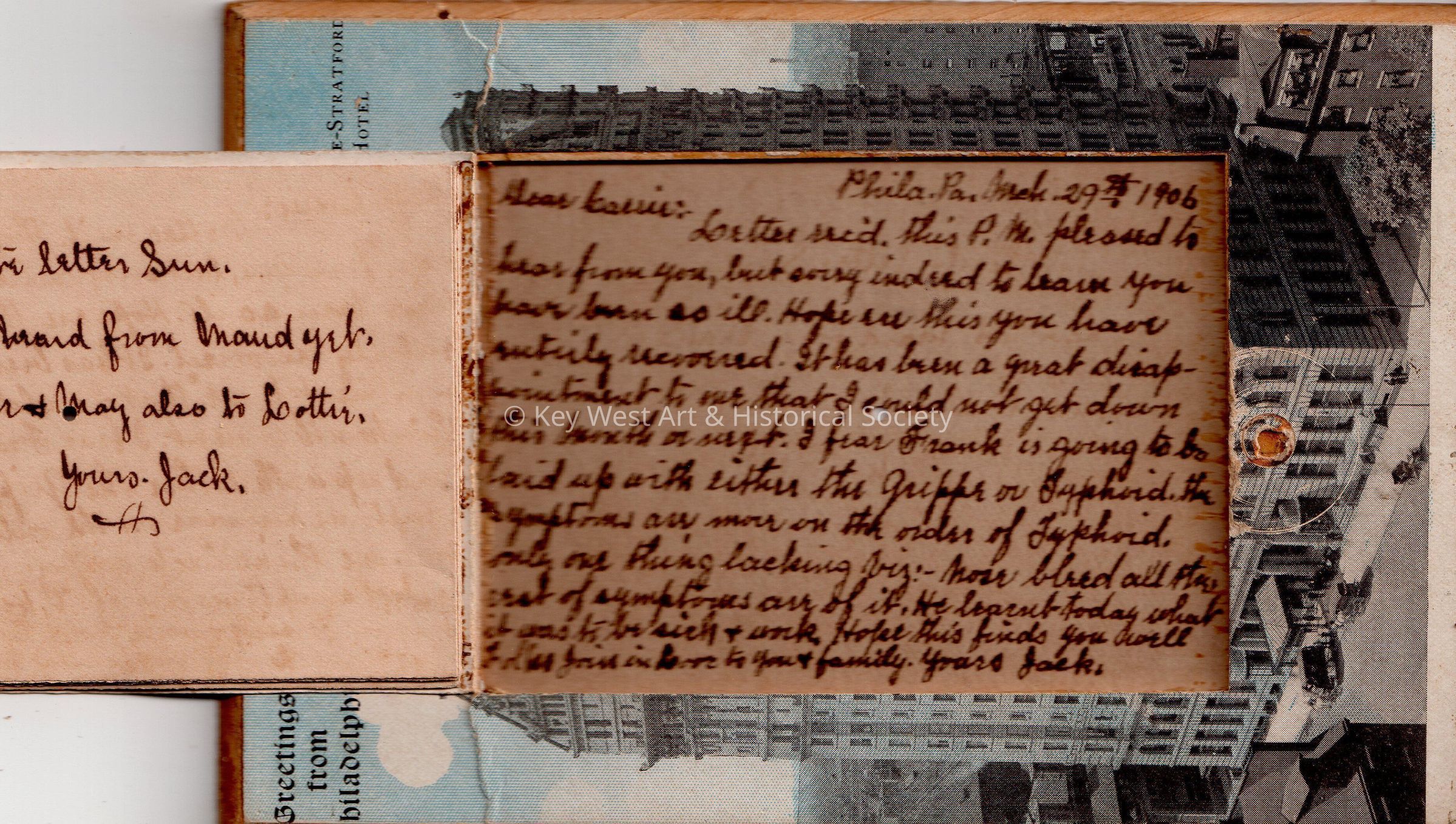 Postcard depicting a large building. The caption reads, ‘Greetings from Philadelphia. Bellevue-Stratford Hotel’. (Very unusual postcard on hard cardboard with pull out of major sites in Philadelphia). The message on the insert reads, ‘Will write letter Sunday. Have not heard from Maud yet. Regards to Dr. & May, also to Cottin. Yours, Jack.’ The message on the front reads, ‘Philadelphia, Pennsylvania, March 29, 1906, Dear Carrie: Letter received this P.M. pleased to hear from you, but sorry indeed to learn you have been so ill. Hope ere this you have entirely recovered. It has been a great disappointment to me that I could not get down this month or next. I fear Frank is going to be laid up with either the grippe or typhoid. The symptoms are more on the order of typhoid. Only one thing lacking is nose bleed all the rest of symptoms are of it. He learnt today what it was to be sick & work. Hope this finds you well. Frank joins in love to you & family. Yours, Jack’.Subject Place