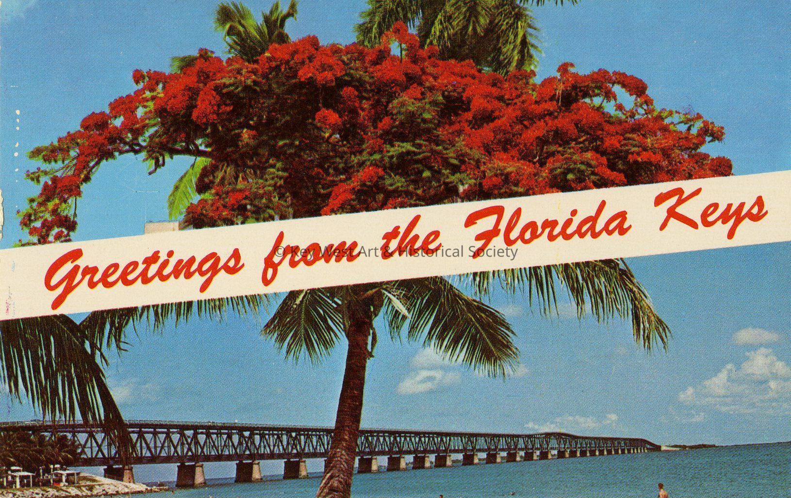 Postcard of two views of the Florida Keys. Caption reads, 'Greetings from the Florida Keys.' Notation on verso, 'Top view - Florida's beautiful Royal Poinciana Tree, sometimes called the 'Flame Tree'. Bottom view - The Bahia Honda Bridge, Overseas Hwy, in The Florida Keys'.Subject Place