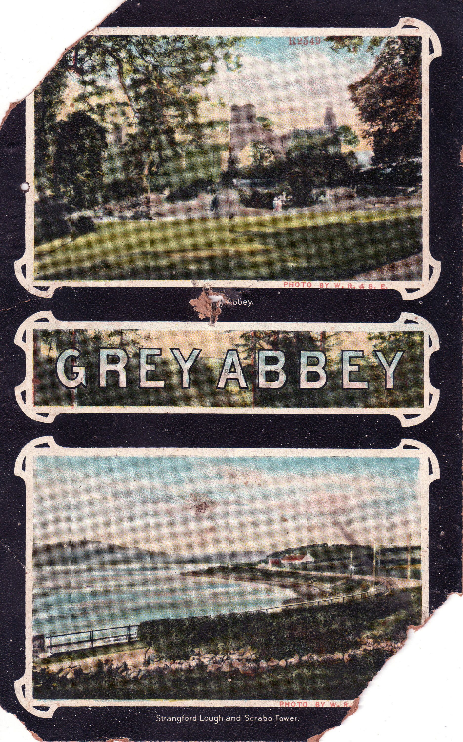 Postcard depicting ruins near the shore. The caption reads, ‘Grey Abbey. Strangford Lough and Scrabo Tower.’Collection