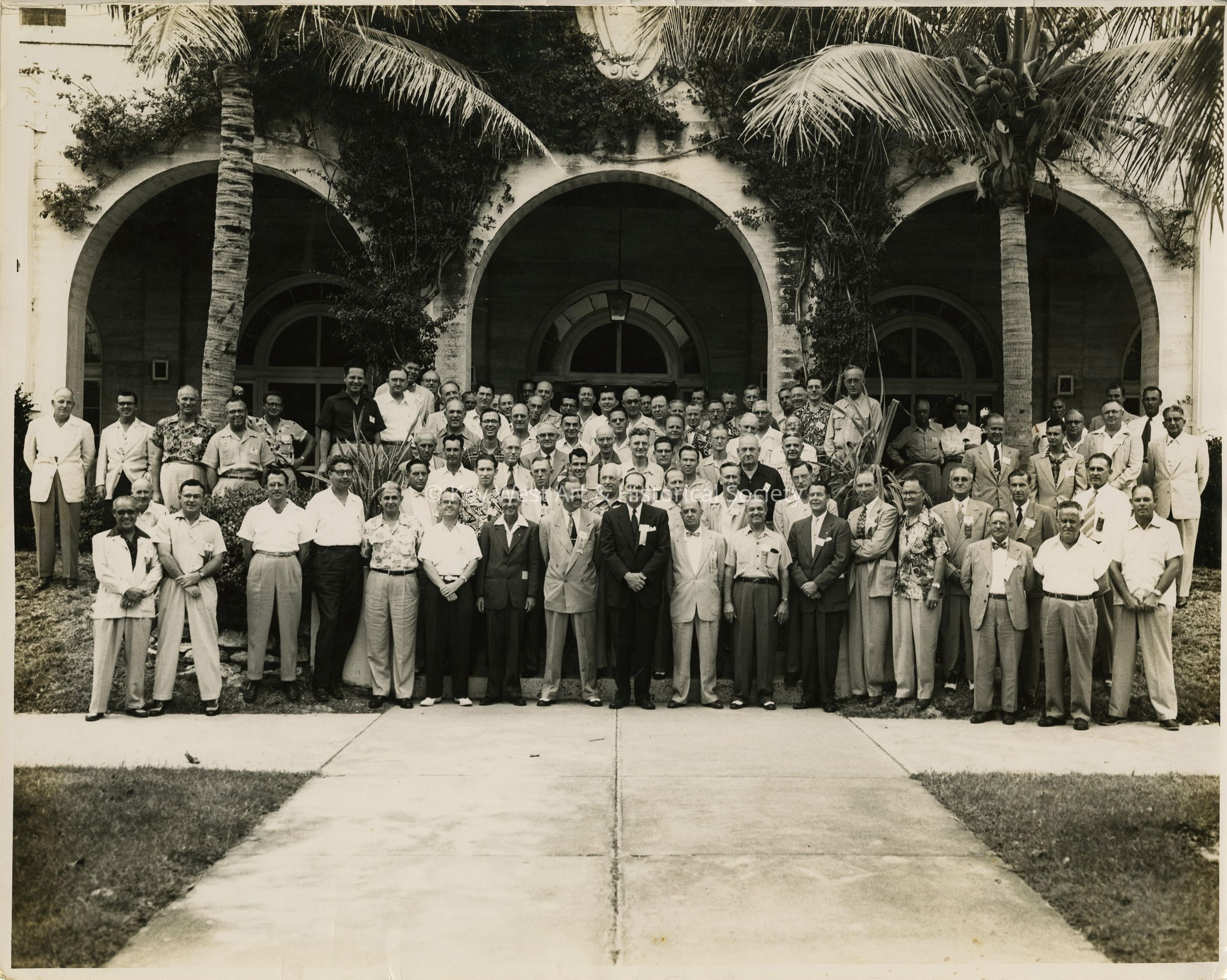 Black and white photograph of a unknown group, possibly a convention, on the grounds of the Casa Marina Hotel.