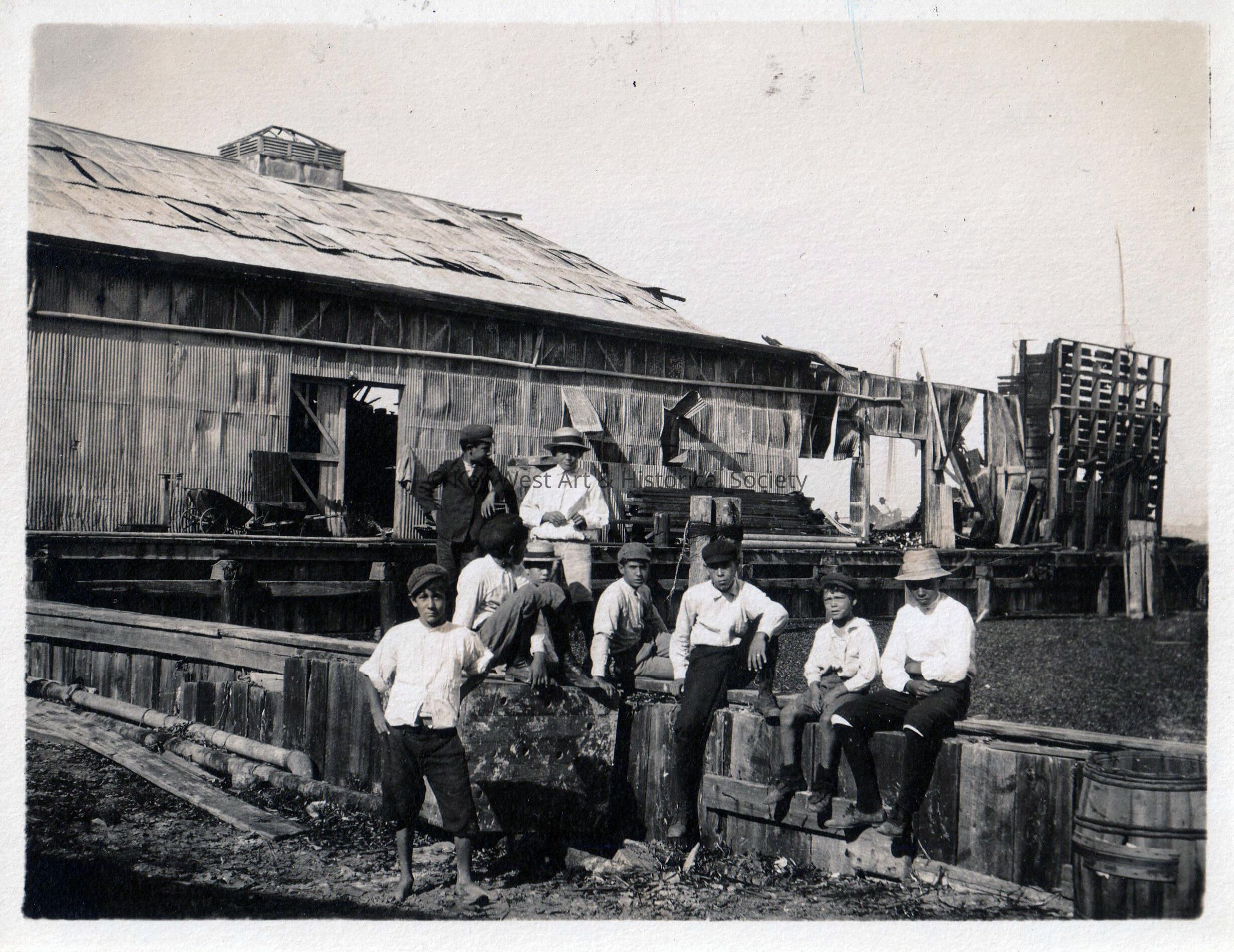 Black and white photo taken after the 1910 hurricane showing the storm damage. Image is of a group of boys sitting or standing in front of a wood fence in front of a damaged warehouse.