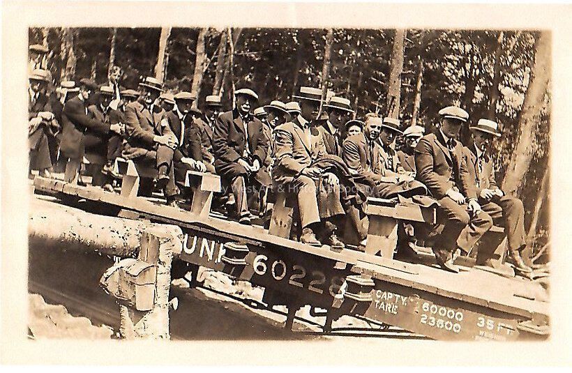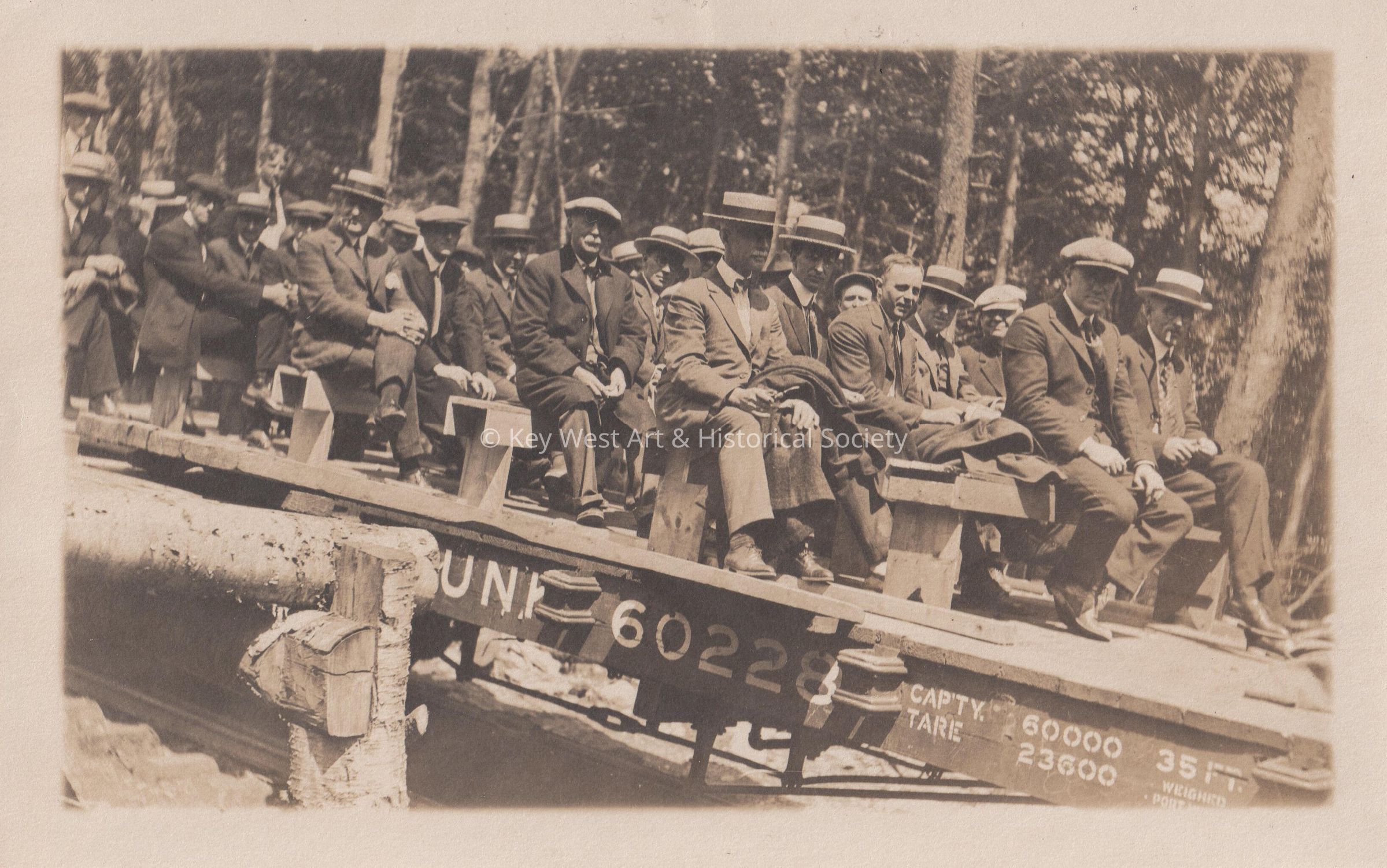 Black and white photograph of unknown group of men on benches (and possibly on a train car).