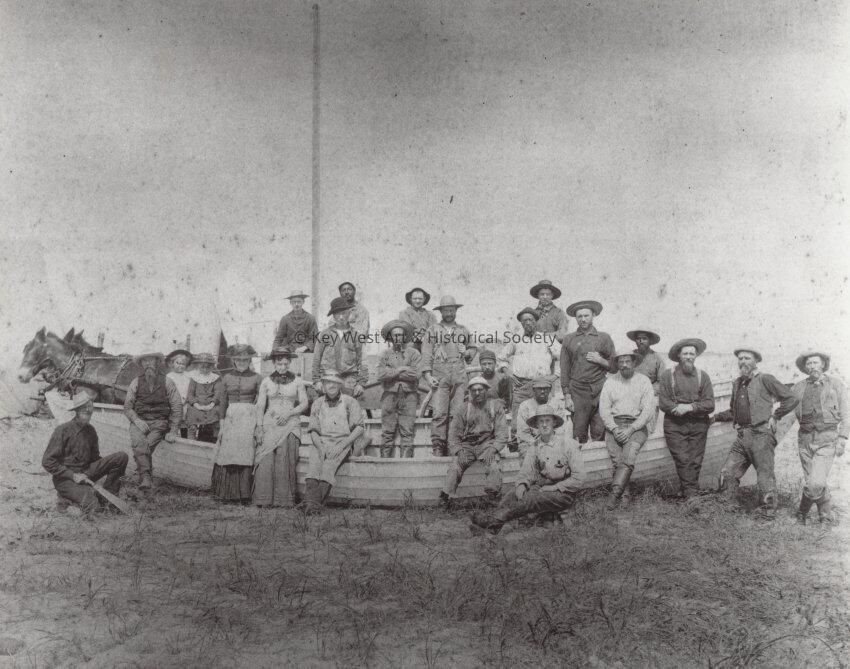 Black and white photograph of an unknown group of men and women with a boat.Collection