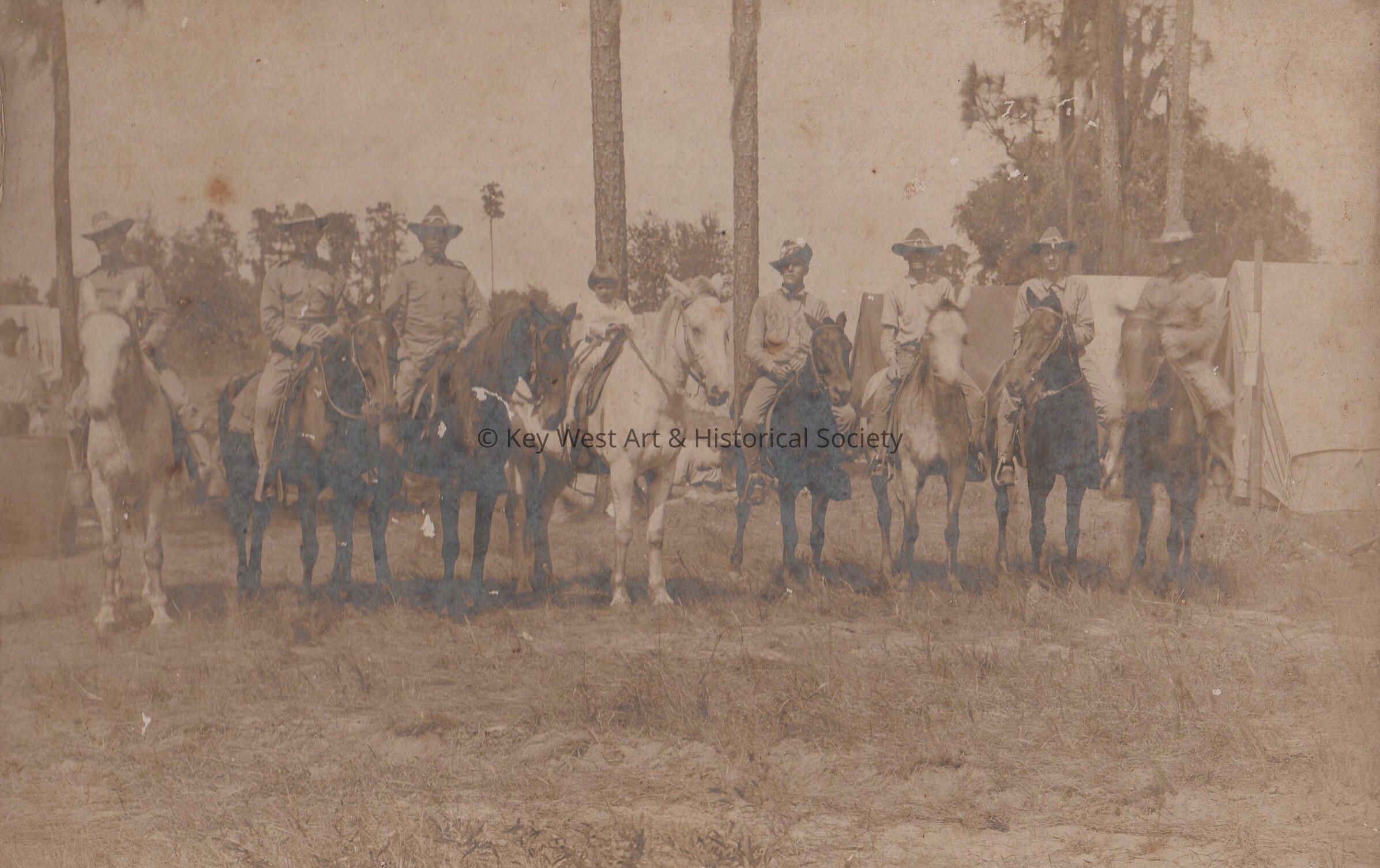 Group of soldiers and a child on horses in front of tents.Collection