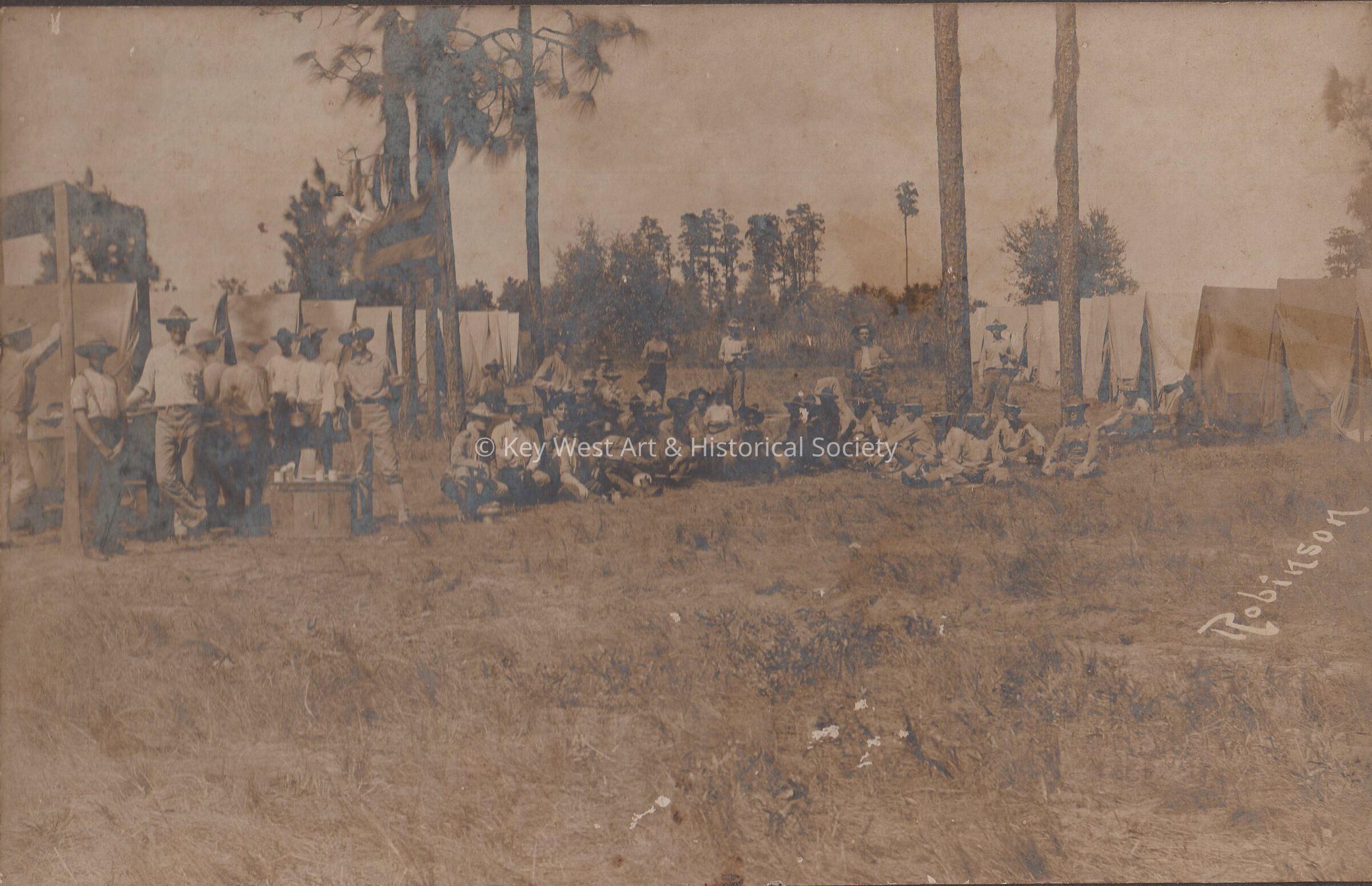 Group of soldiers eating near tents