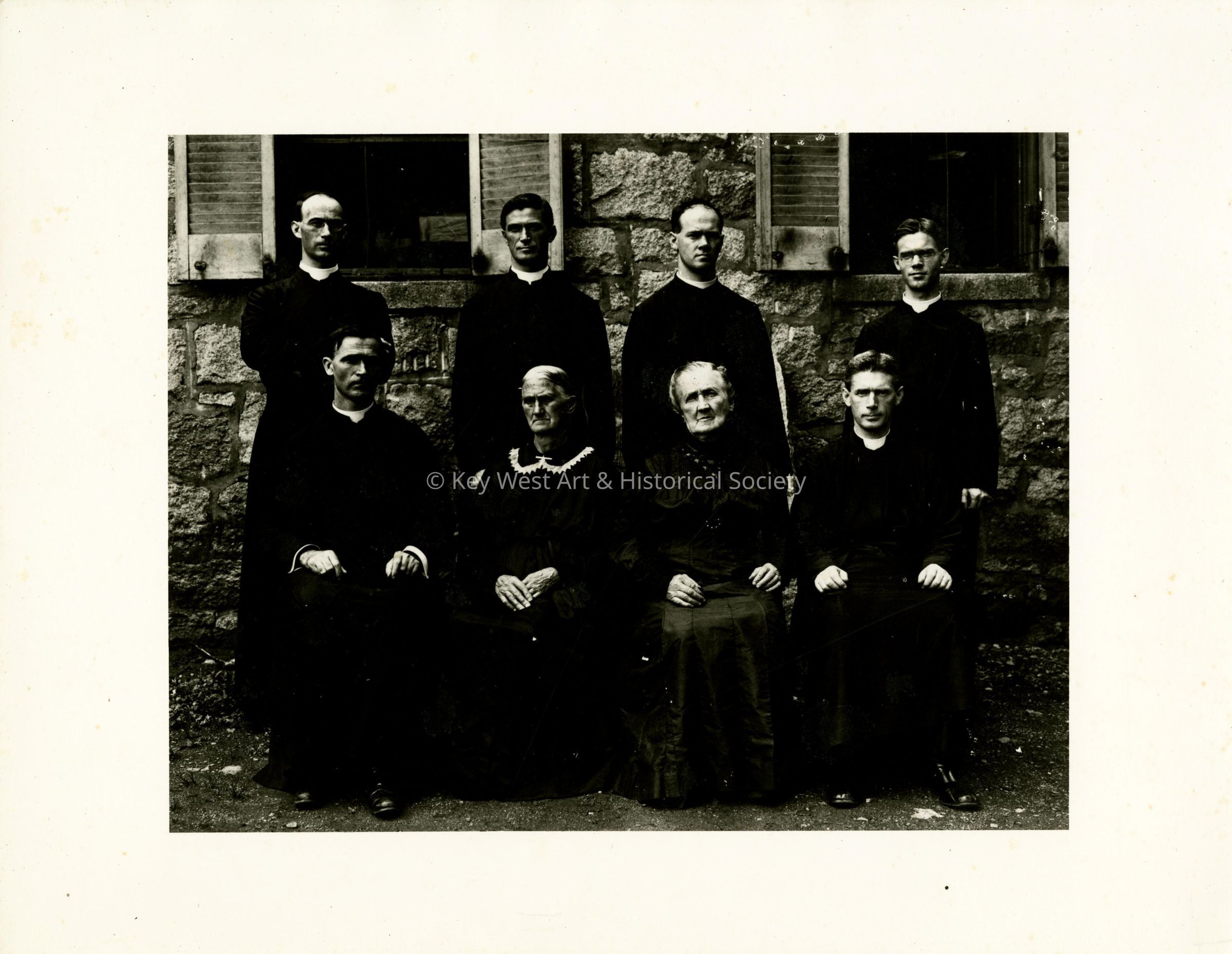 Black and white photograph of a group of unknown priests alongside two women.