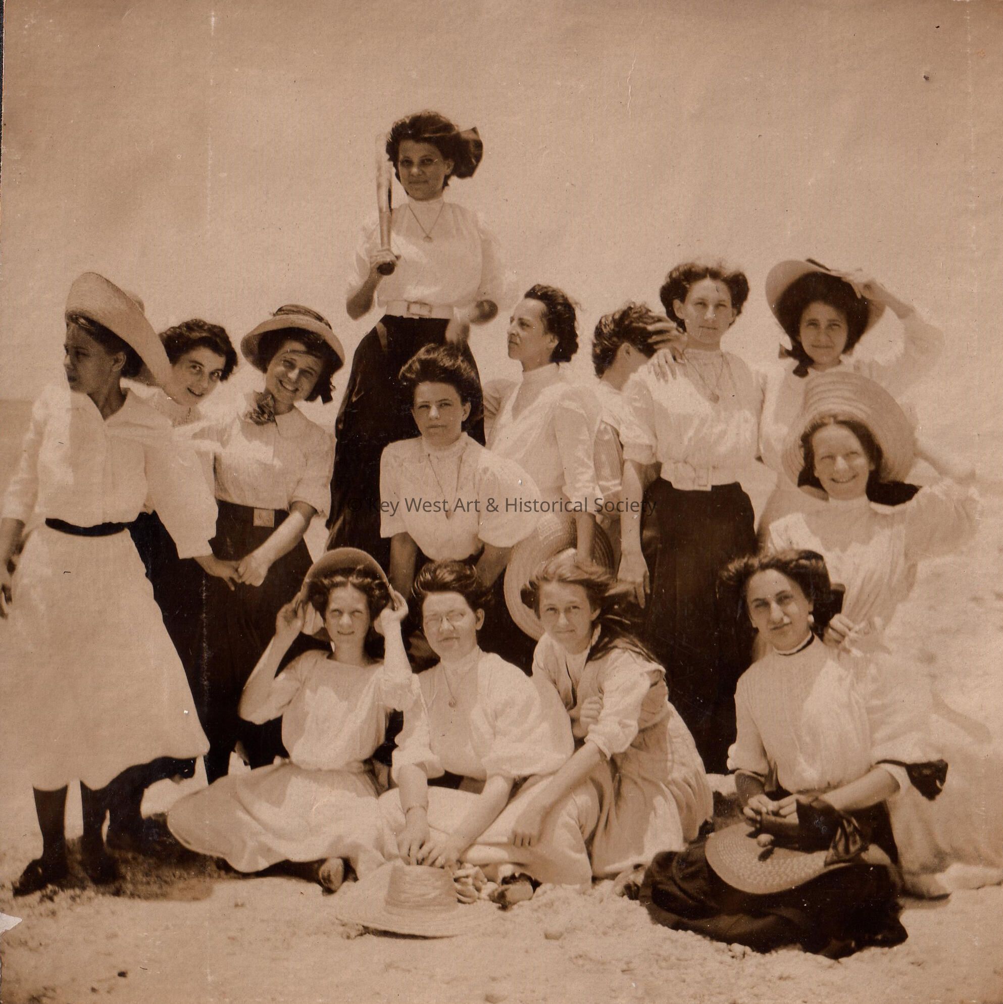 Black and white photograph of a group of unknown women posing on a beach. One of them is holding a baseball bat. The image was included in a family photo album whose main subject appears to be a girl named Alice. Photographs in the album include her with her family, her friends and fellow students at the Convent of Mary Immaculate school in Key West.