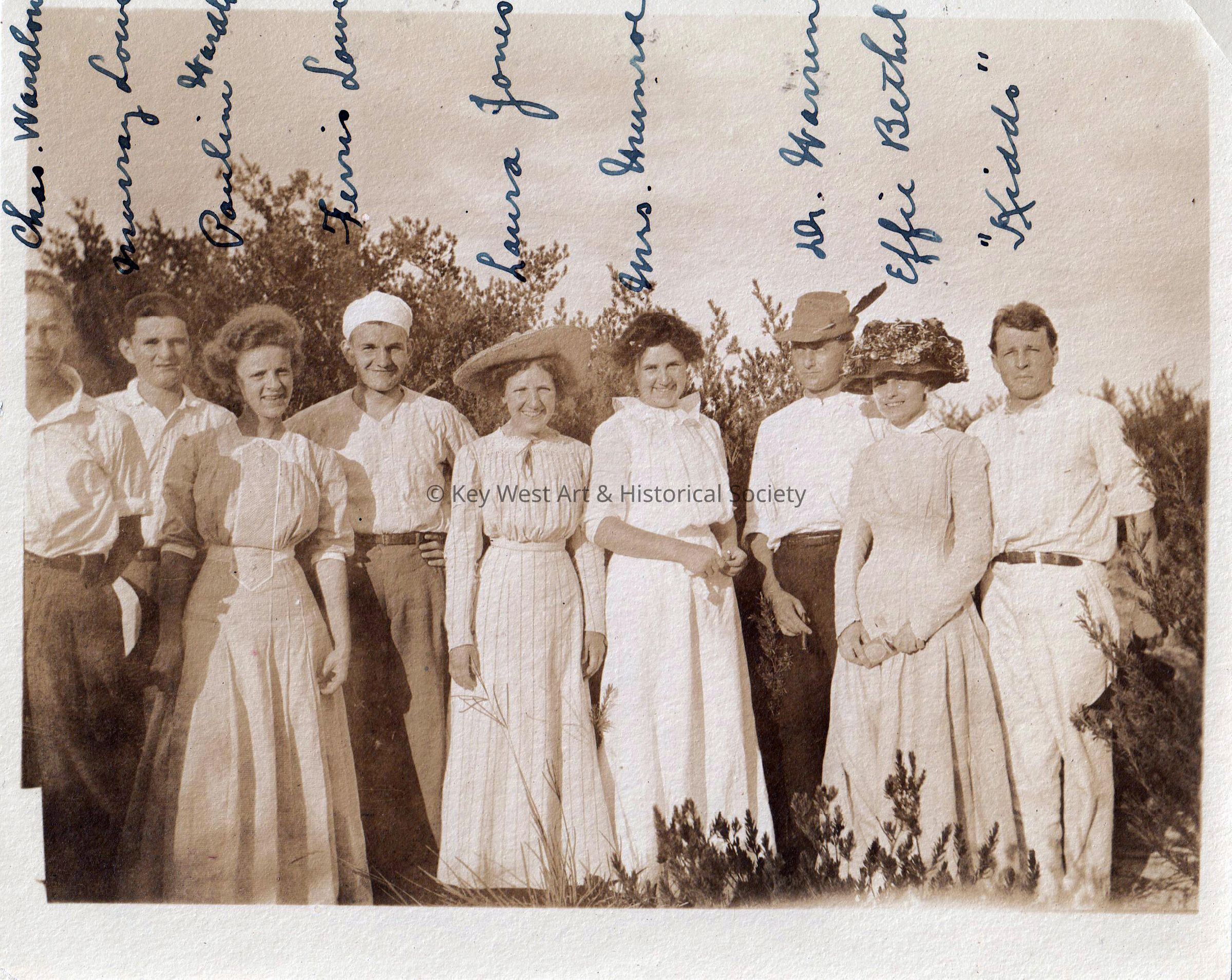 Black and white photograph taken on Loggerhead Key in the Dry Tortugas. From left to right, Charles. Wardlow, Murray Lowe, Pauline Wardlow, Ferris Lowe, Laura Jones, Mrs. Munroe, Dr. Warren, Effie Bethel, and 'Kiddo'.Collection