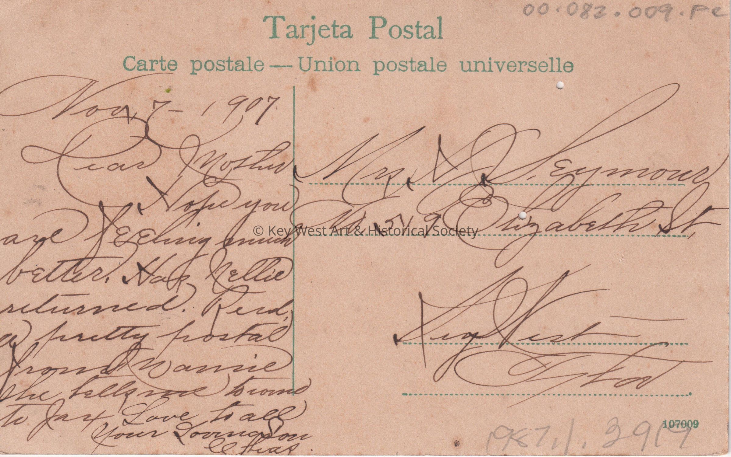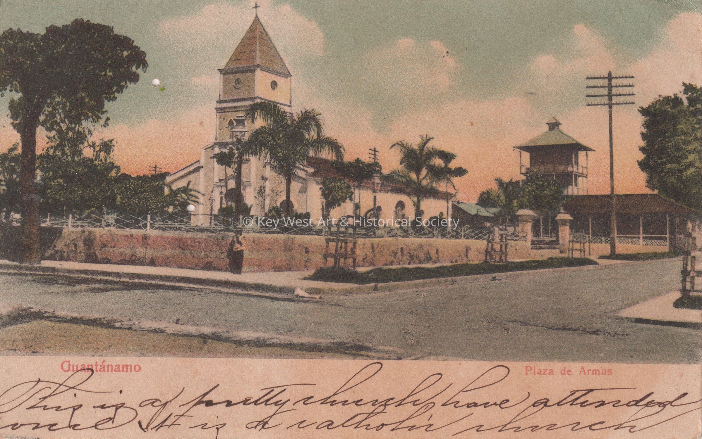 Postcard depicting a large church. The caption reads, ‘Guantanamo. Plaza de Armas.’ The message on the front reads, ‘This is a pretty church, have attended once. It is a catholic church.’ The message on the verso reads, 'November 7, 1907, Dear Mother, I hope you are feeling much better. Has Nellie returned? Received a pretty postal from Frannie. She tells me to come to Jacksonville. Love to all, Your Loving Son, Chas.’ The card is addressed to Mrs. J. Seymour, No. 519 Elizabeth Street, Key West, Florida.Collection