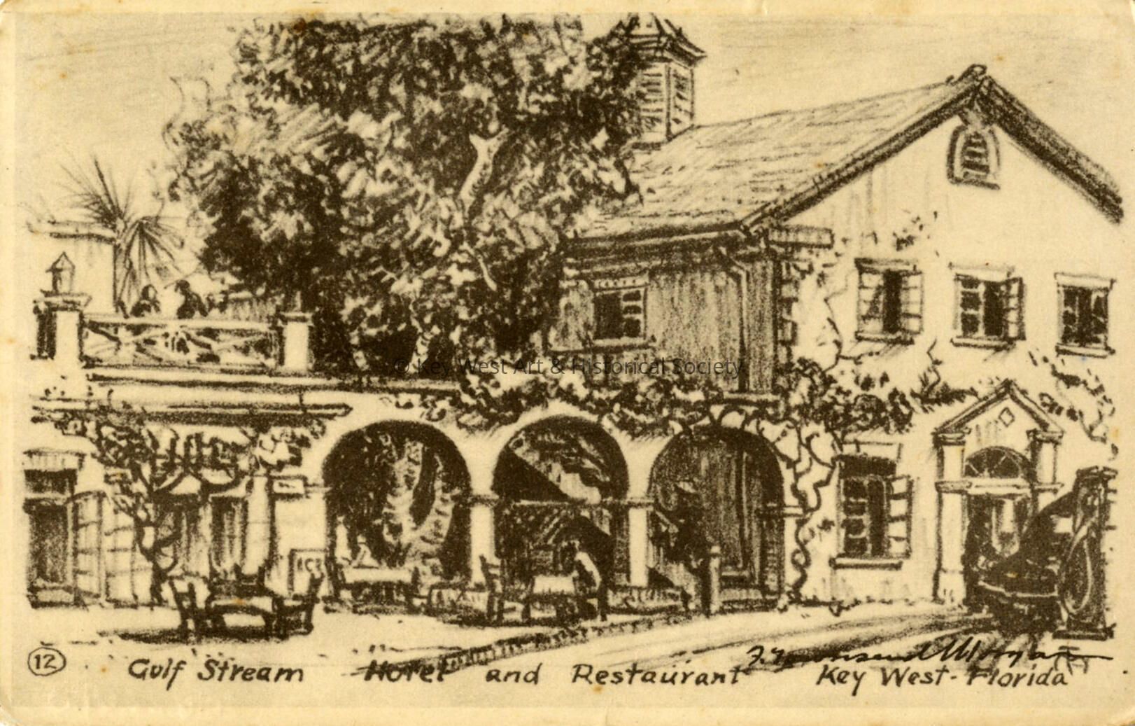 Postcard depicting the Gulf Stream Hotel and Restaurant on the corner of Simonton Street and Truman Avenue.Subject Place
