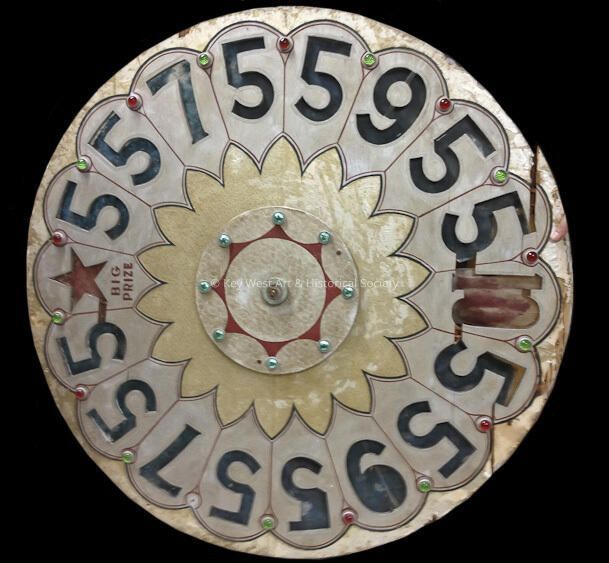 Round wooden gambling wheel from the Habana Madrid Nightclub formerly located at 431 Front Street, Key West, Florida. The wheel is painted gold, red and black. The center of the wheel is decorated with 8 blue cut-glass circles. The outer part of the wheel is decorated with green and red cut-glass circles. There are 17 numbers cut out and 1 star. The cut out numbers are covered from the rear of the wheel with celluloid paper. The wheel had a 4-legged iron stand that is no longer with the wheel.Collection