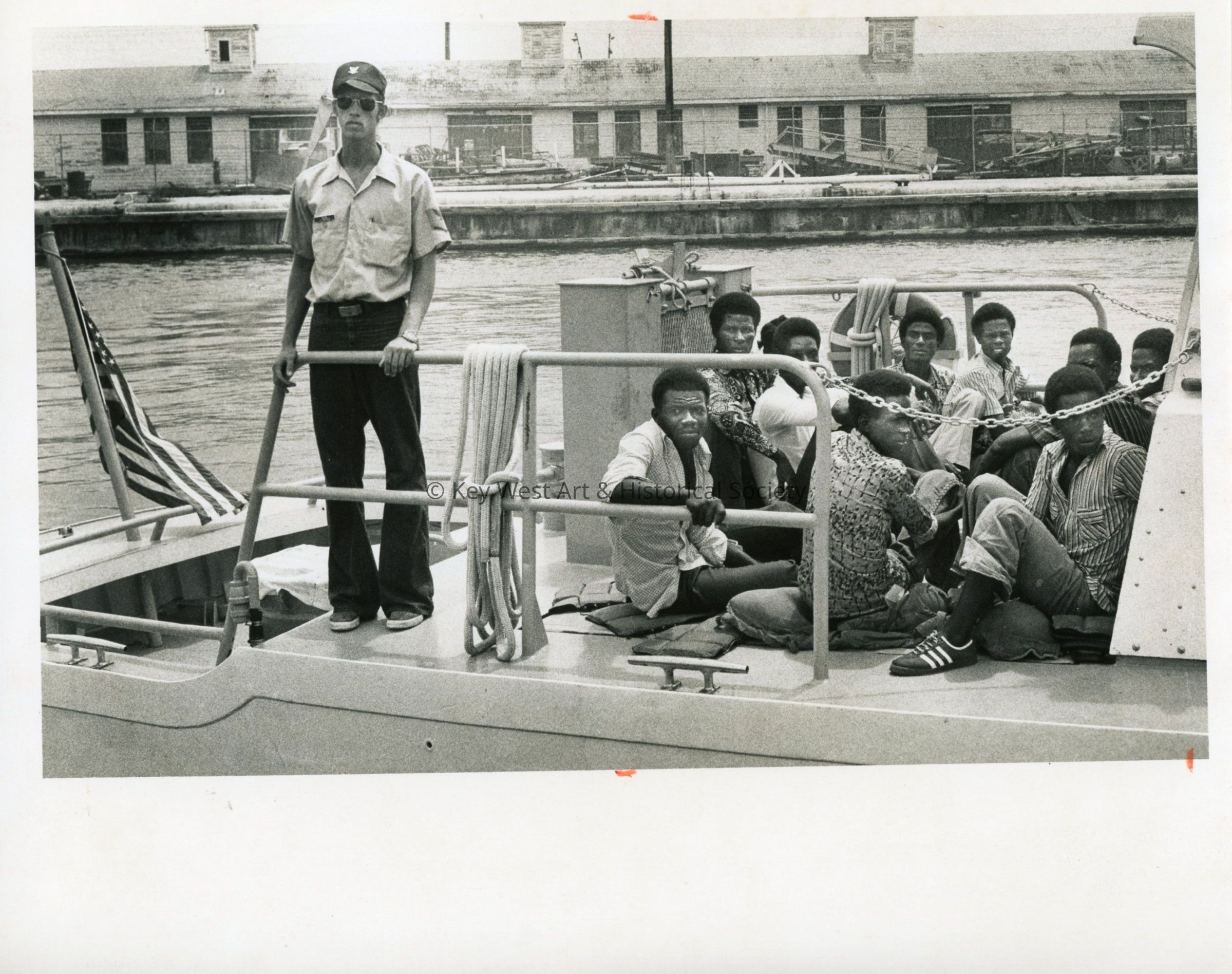 Black and white photograph of Haitian refugees known as " boat people" arriving to NAS Key West in the late 1970s.