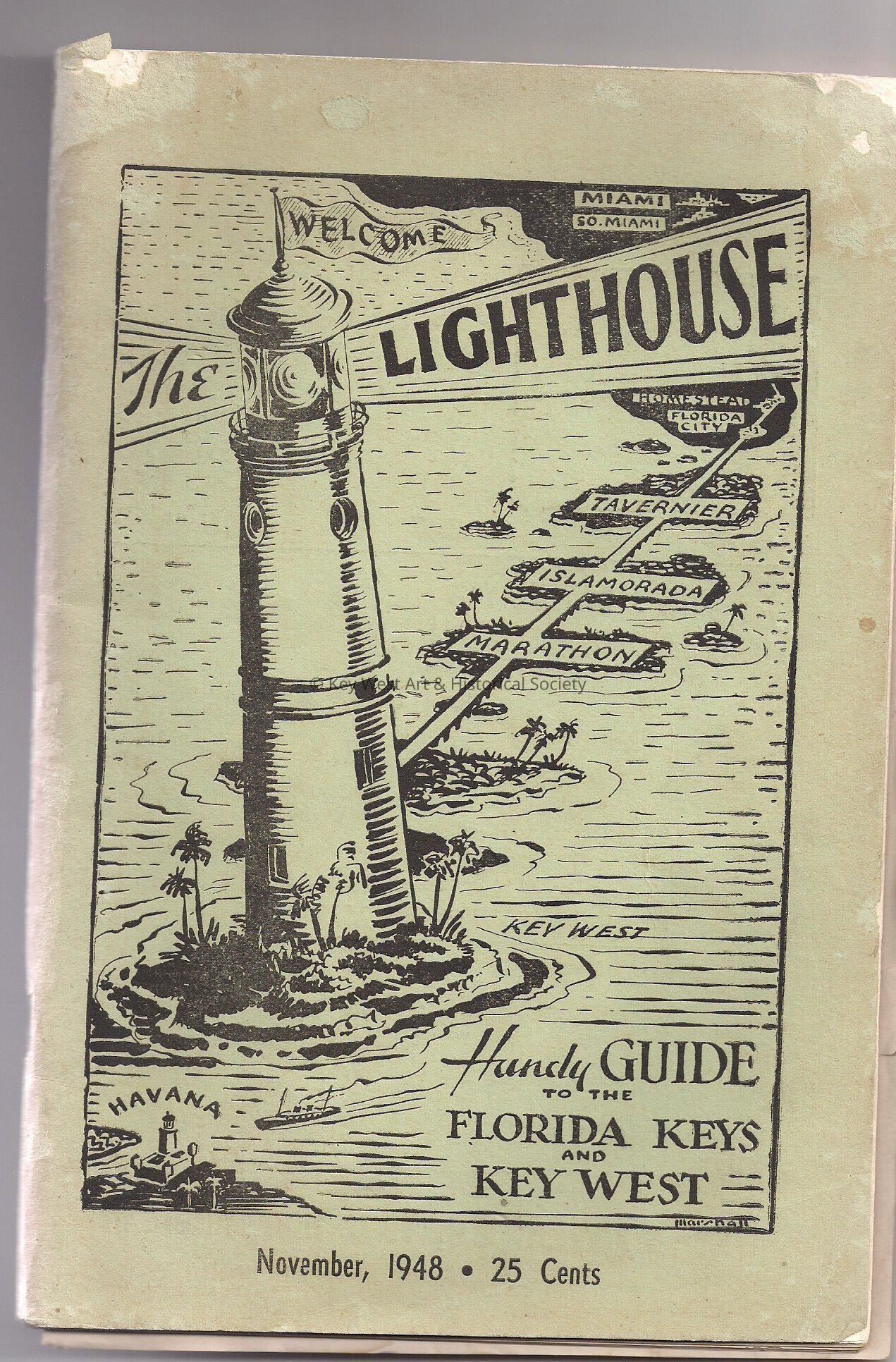 Booklet titled "Handy Guide to the Florida Keys and Key West" from November 1948. The front cover has a picture of the Key West Lighthouse. Book has advertisements for places located in the keys.