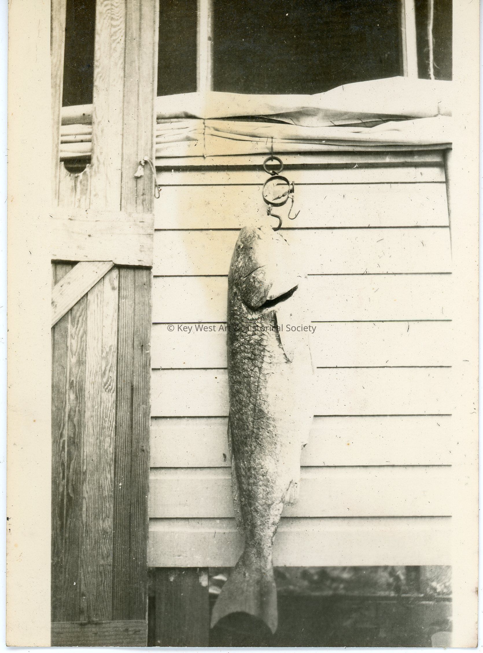 Black and white photograph of a fish hanging from a hook against a wall. The photo was part of a photograph album began by Victor H. Baker in 1940.