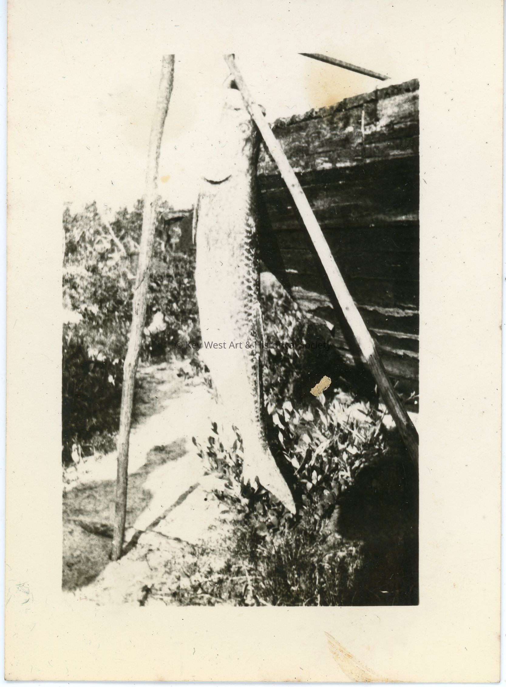 Black and white photograph of a long fish hanging between wooden poles. The photo was part of a photograph album began by Victor H. Baker in 1940.