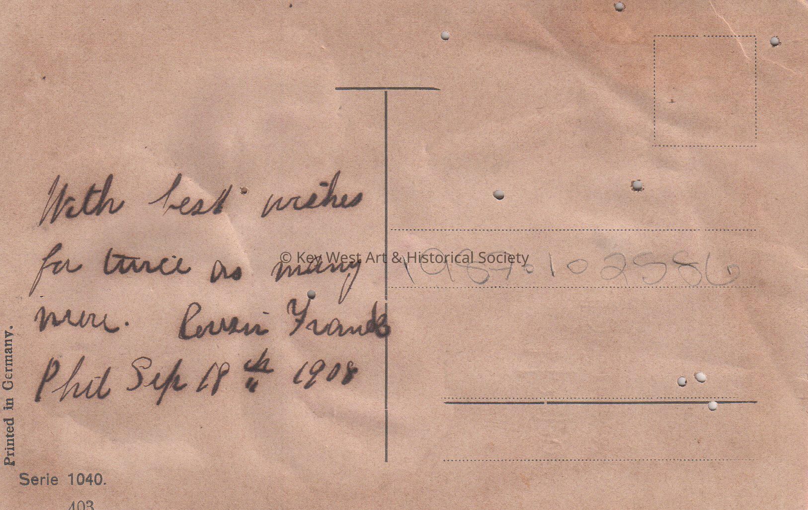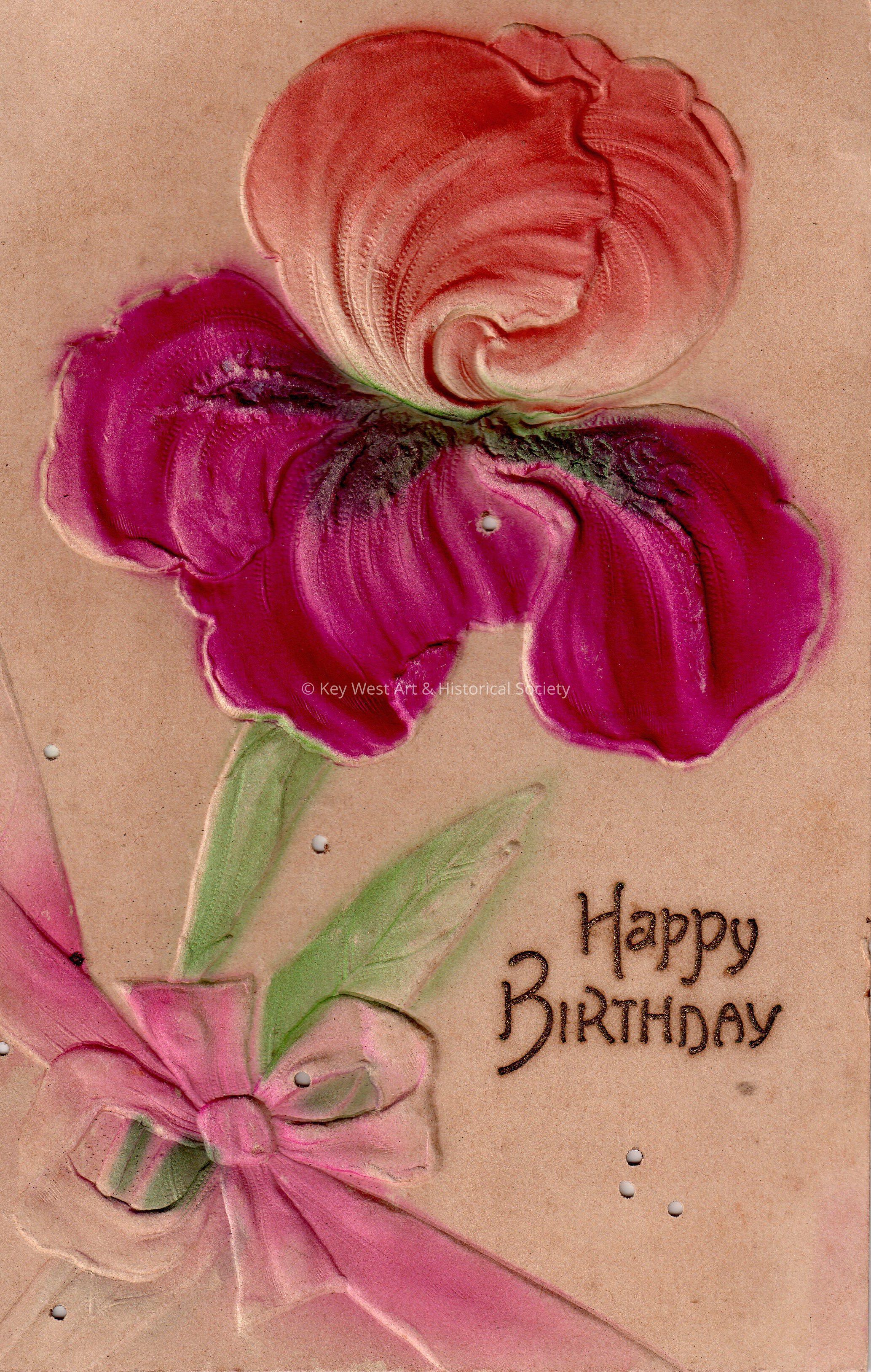 Postcard depicting an Iris (flower). The caption reads, ‘Happy Birthday’. The message on the verso reads, ‘With best wishes for twice as many more, Cousin Frank, September 18, 1908'.Collection