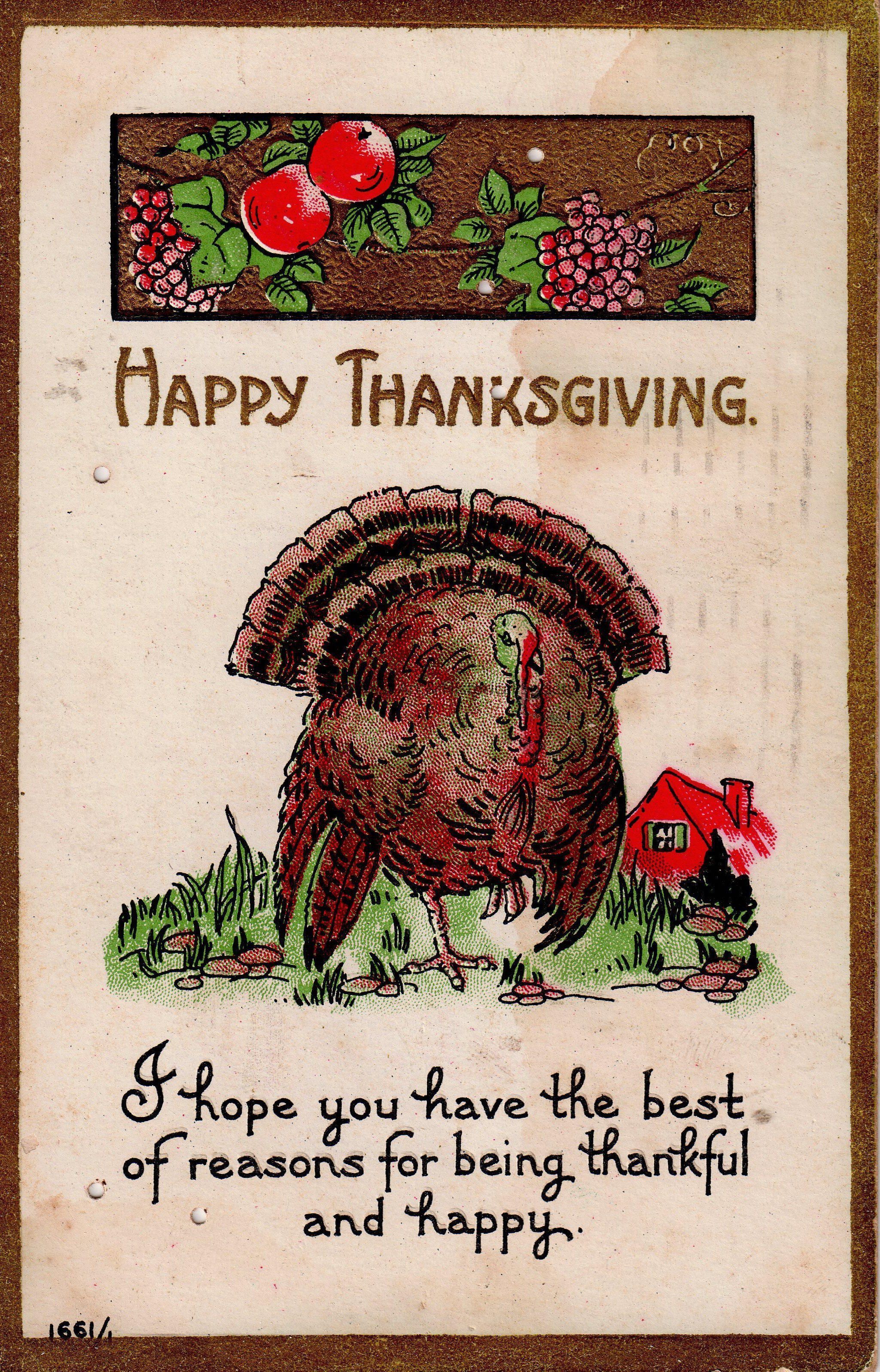 Postcard depicting a turkey. The caption reads, ‘Happy Thanksgiving – I hope you have the best of reasons for being thankful and happy.’Collection