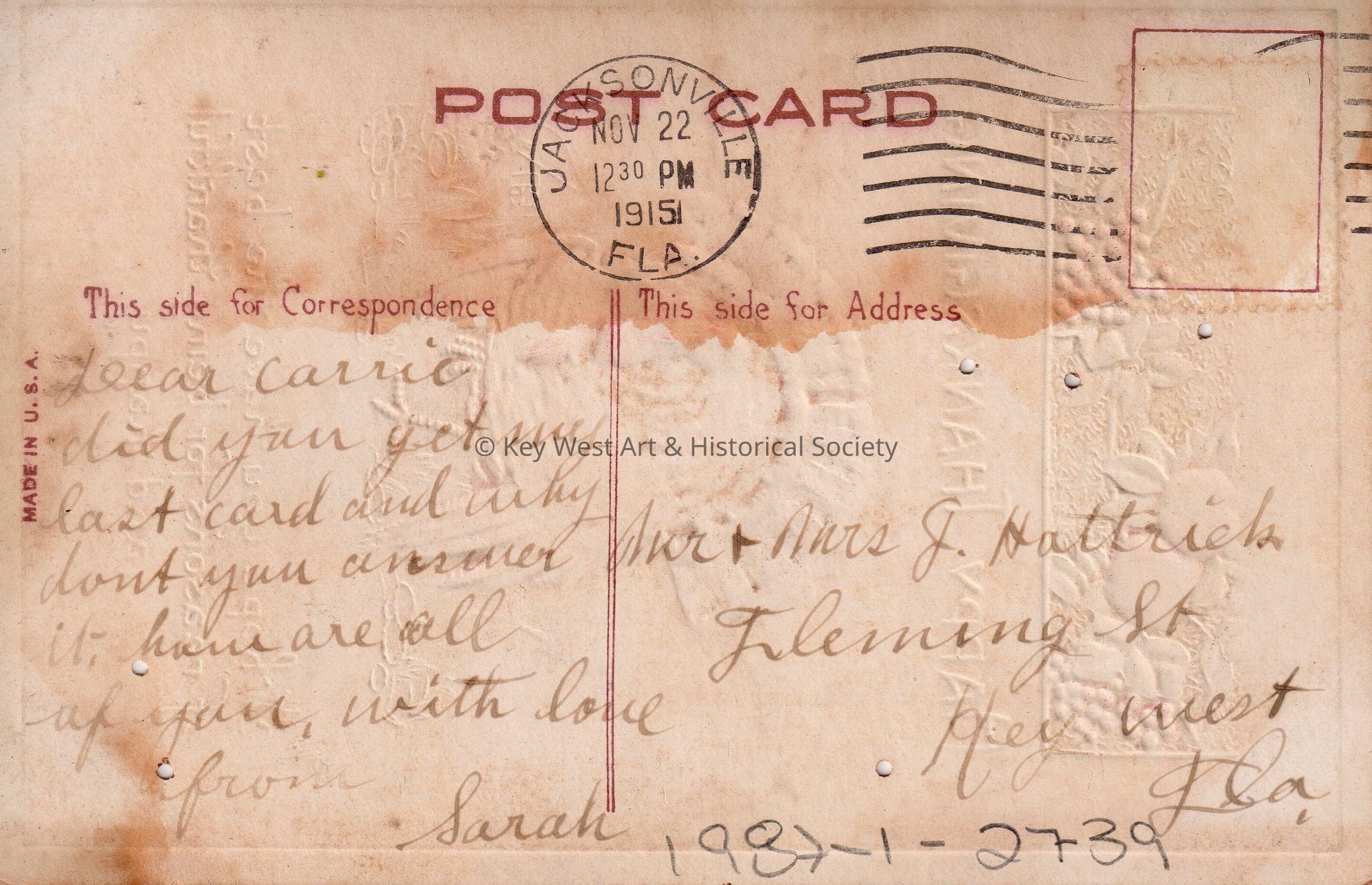 Dear Carrie, Did you get my last card and why don’t you answer it. How are all of you? With love, from Sarah.Language
