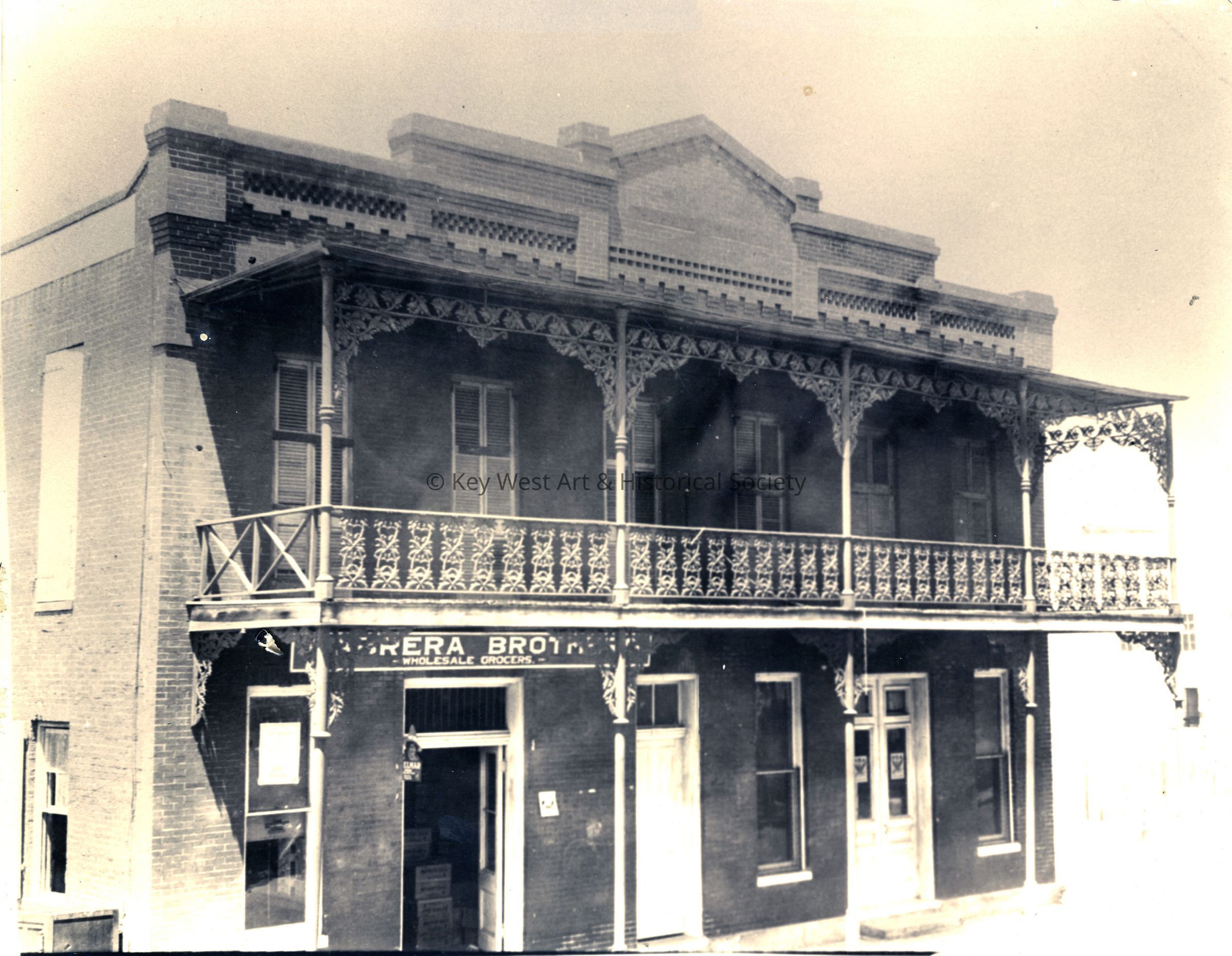 Black and white photograph the Harbor House building at 423 Front Street when it was occupied by Cabrera Brothers wholesale grocers. Provisions, cutlery, crockery, fancy candies, cigars and candles were available to islanders when it was occupied as a general grocers prior to Cabrera Brothers purchasing the building in 1920. Under their ownership, the store supplied cheeses, liquors, smoked meats, fresh fruits and vegetables.Photograph Details