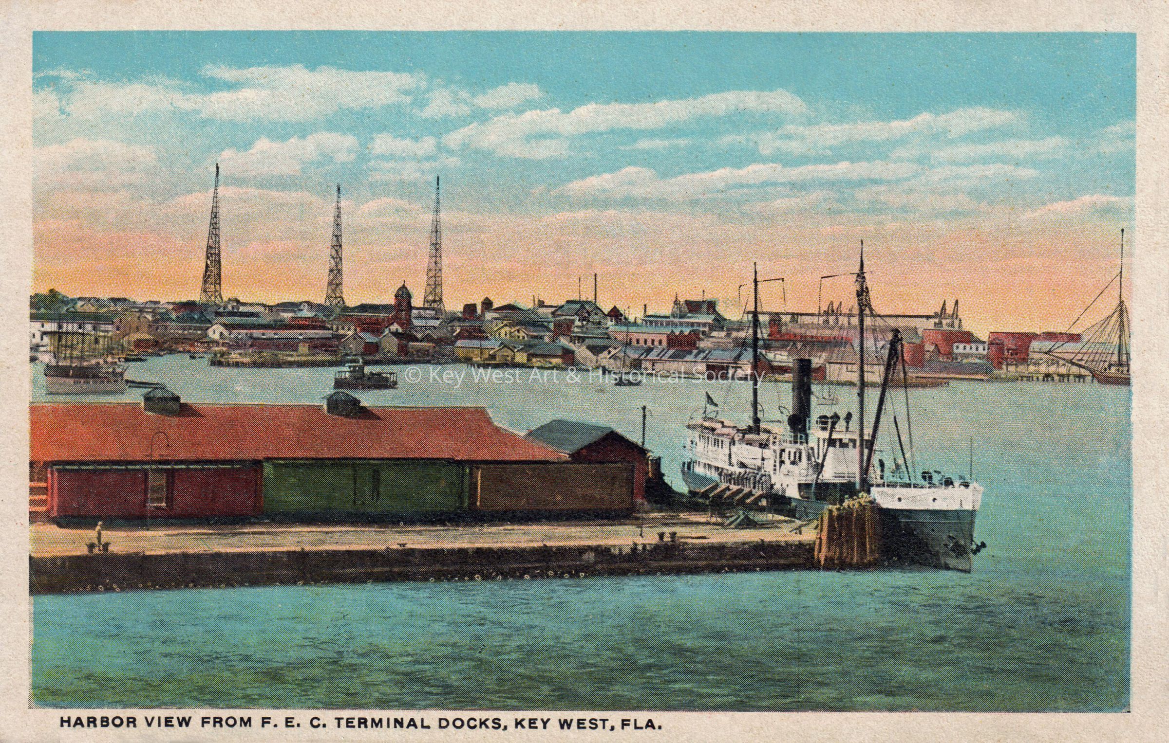 Postcard depicting the harbor of a town. The caption reads, ‘Harbor View from F.E.C. Terminal Docks, Key West, Florida’.Collection