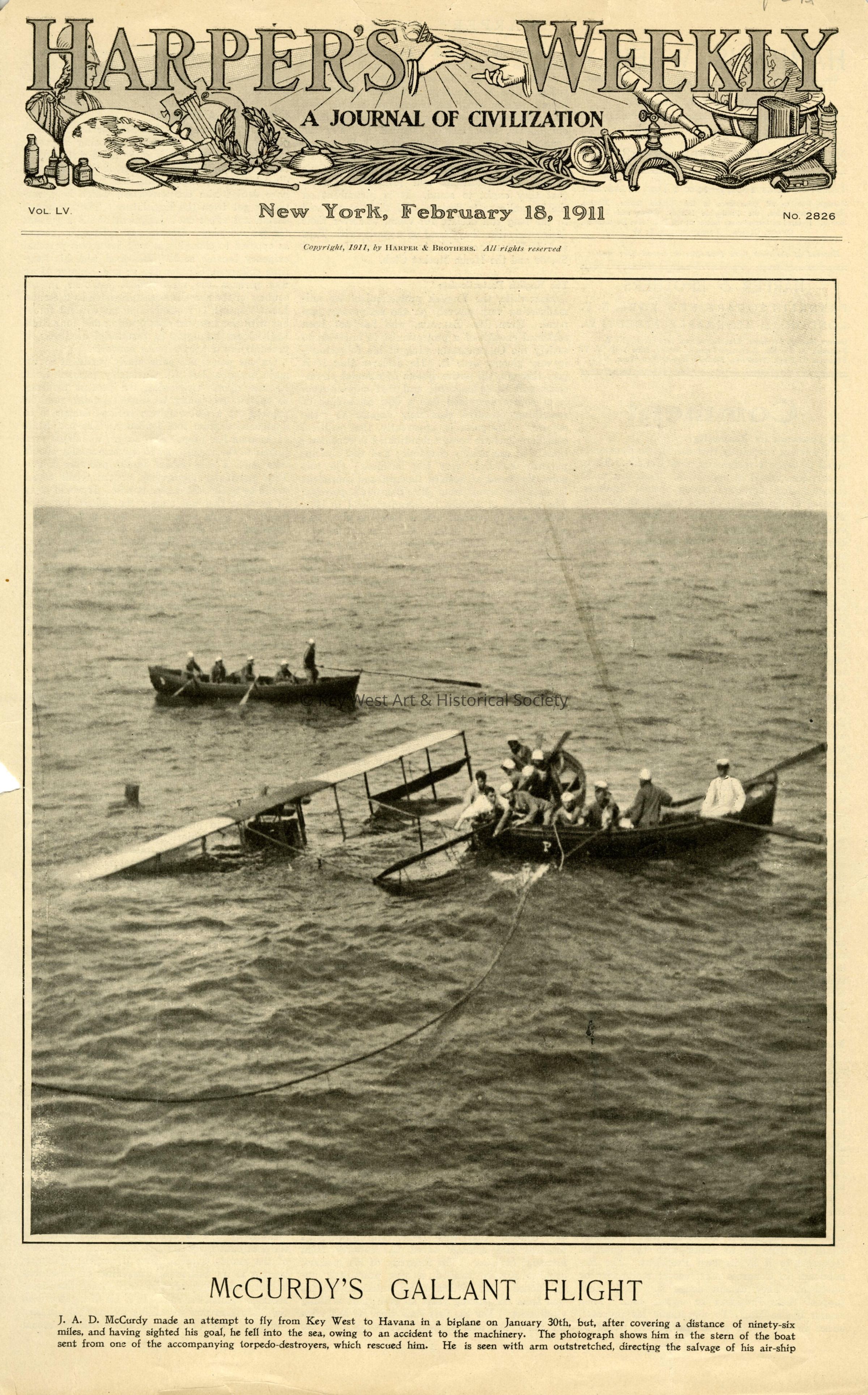 Double-sided cover page of an edition of Harper's Weekly (Vol. LV, Number 2826) dated February 18, 1911 containing information on the failed attempt by John Alexander Douglas McCurdy to fly from Key West to Havana, Cuba.Collection
