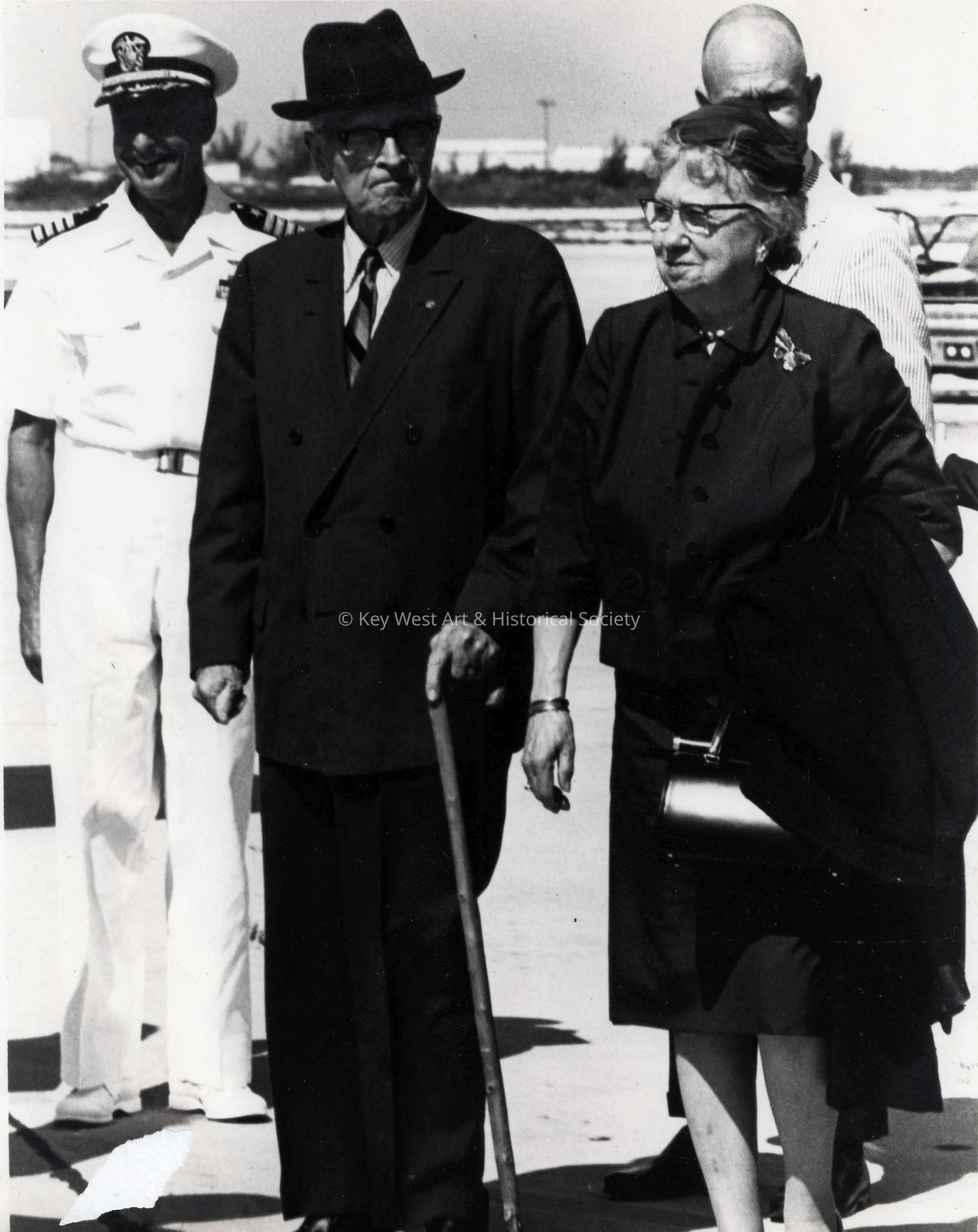 Black and white photograph of former U.S. President Harry S. Truman and his wife Bess at Naval Air Station Key West.