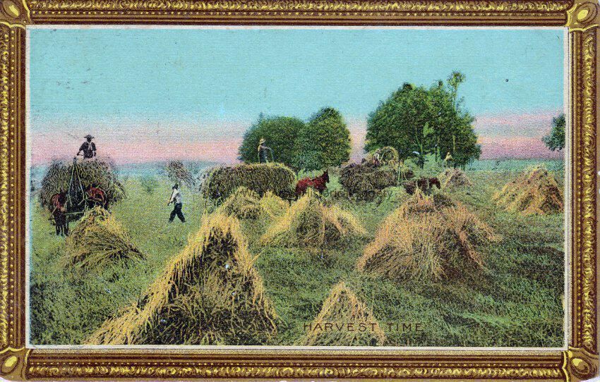 Postcard depicting a framed painting of men in a hay field loading horse-drawn carts with harvested hay. The caption reads, ‘Harvest Time’.