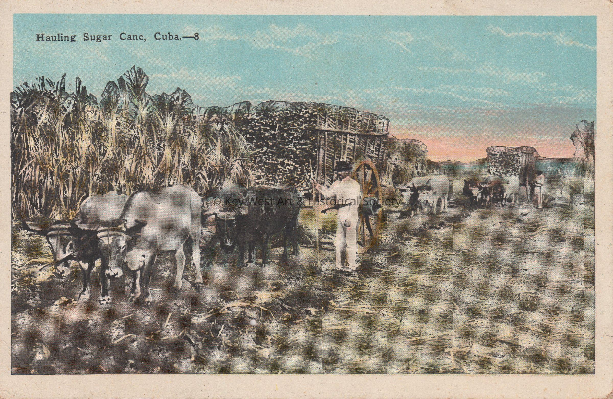 Postcard of oxen pulling carts of harvested sugar cane. The caption reads, ‘Hauling Sugar Cane, Cuba.’ The description on the verso reads, ‘Cuba produces one-fifth of the world’s sugar supply, which industry represents 85% of Cuba’s exports.’Subject Place