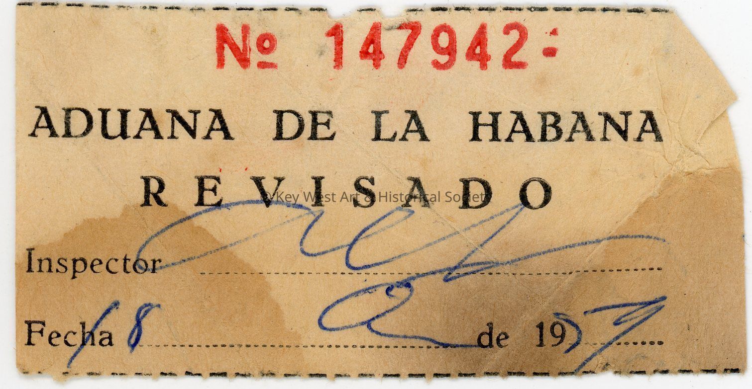 A customs ticket with black and red text on thin white paper. The ticket is numbered 'No. 147942' and reads 'ADUANA DE LA HABANA REVISADO.' An inspector has signed and dated the ticket in blue ink. The ticket was found inside a beaded clutch (1992.34.0008).Collection