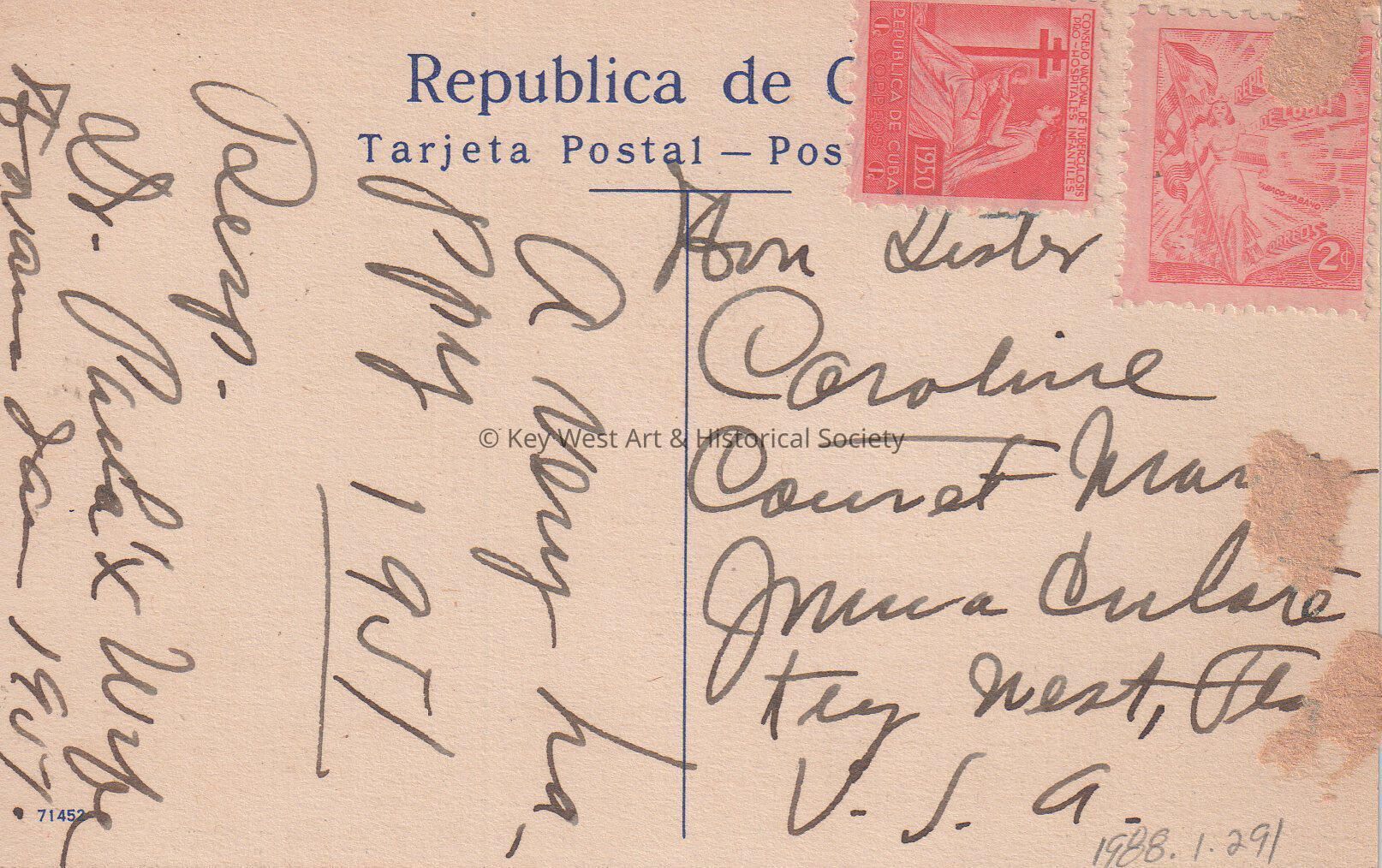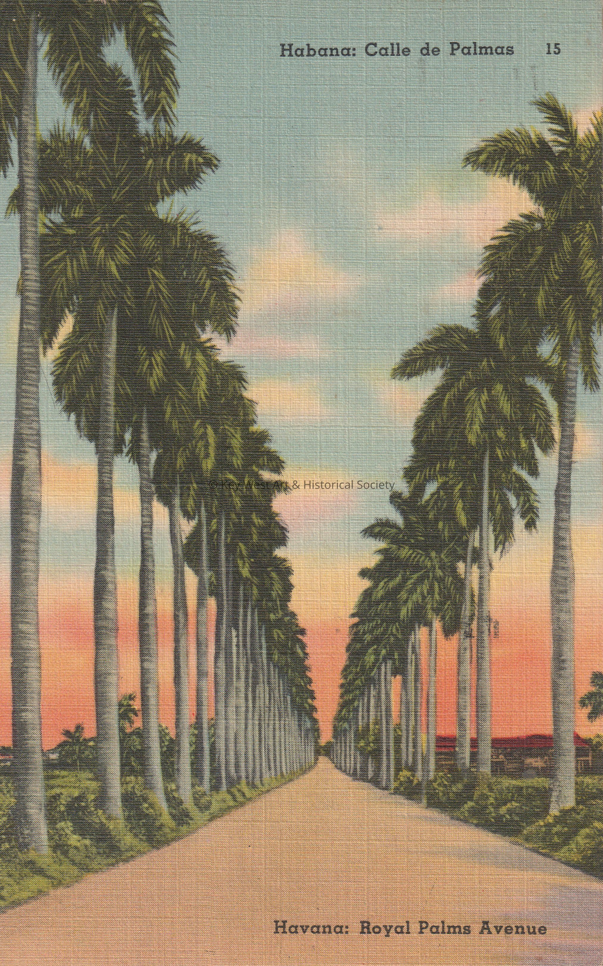 Postcard of a palm tree-lined road. The caption reads, ‘Habana: Calle de Palmas. Havana: Royal Palms Avenue.’ The message on the verso reads, ‘A very Happy 1951. Respectfully, Dr. Paula & Wife, Havana, January, 1951’. The postcard is addressed to Ann Lester, Caroline Court and ____, Key West, Florida, U.S.A.Subject Place