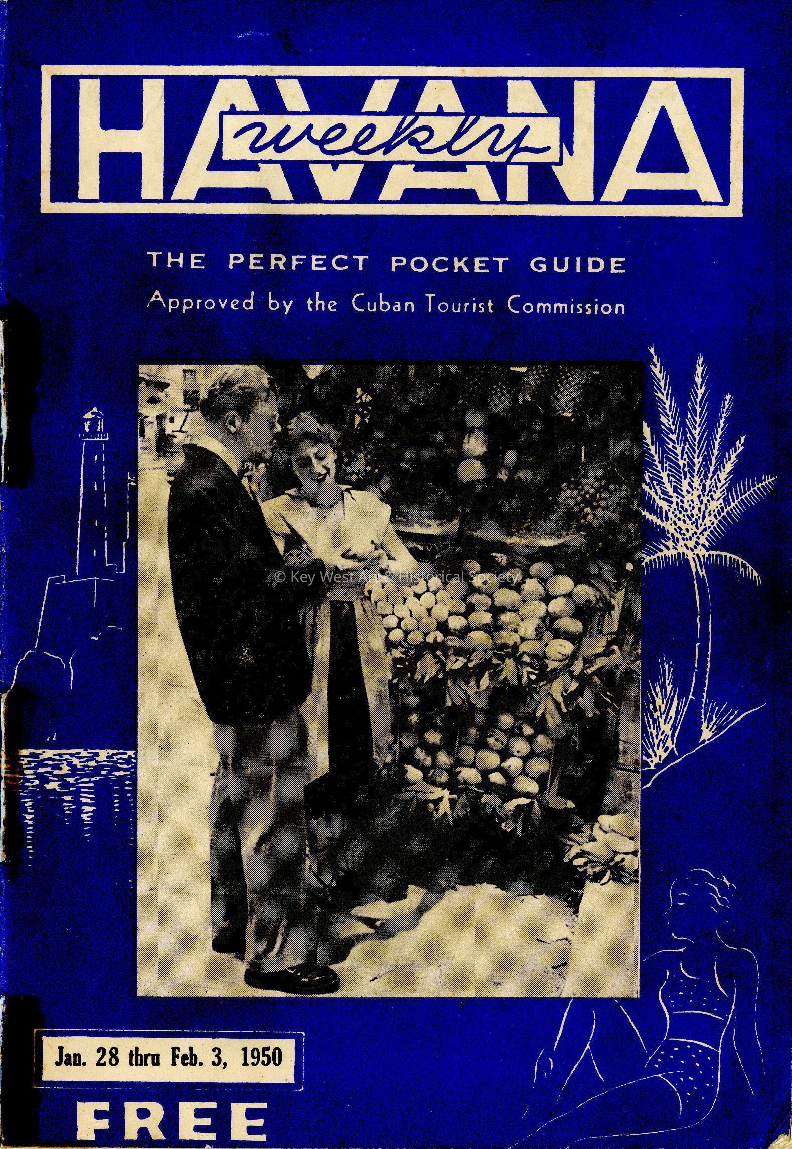 Promotional foldout booklet of thirty pages featuring information for tourists visiting Havana, Cuba the week of January 28, 1950. Many advertisements for Havana businesses.Collection