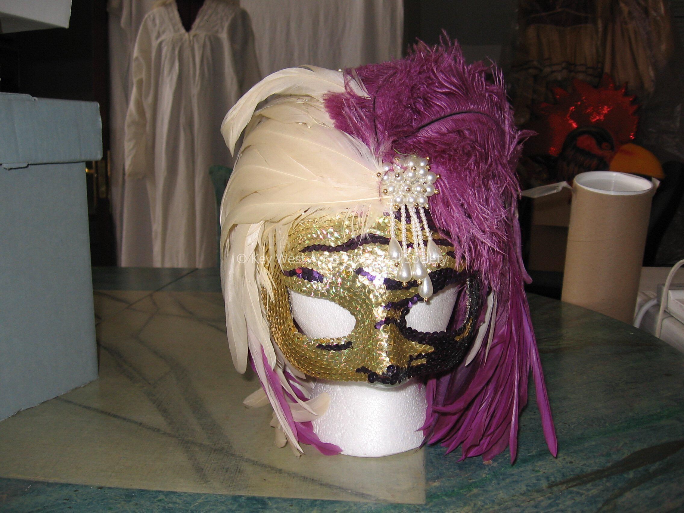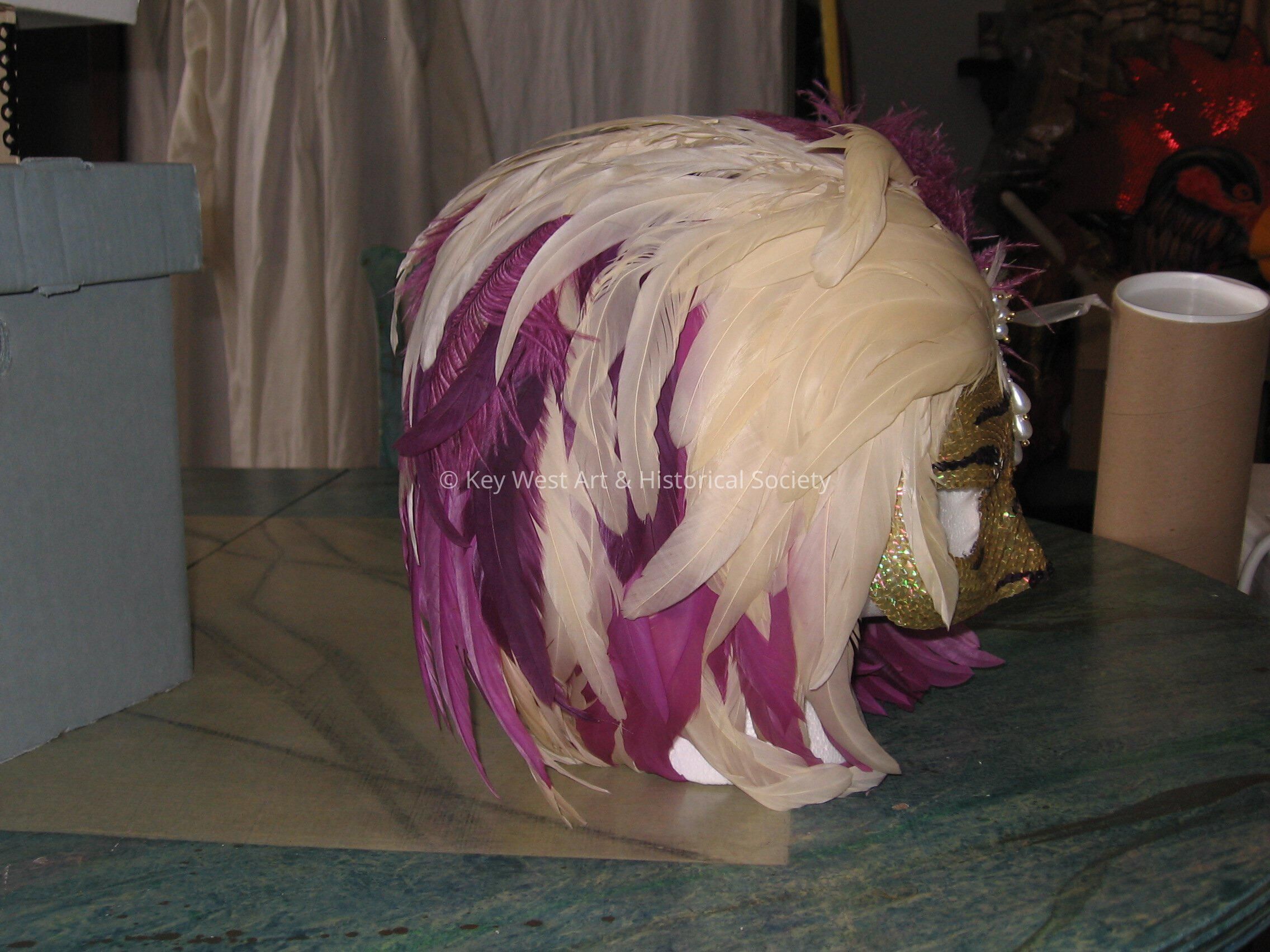 Full headdress mask designed by Mike Stark. Gold and purple sequin mask with ivory and purple feathers covering the head. Pearl applique on left forehead of the mask.
