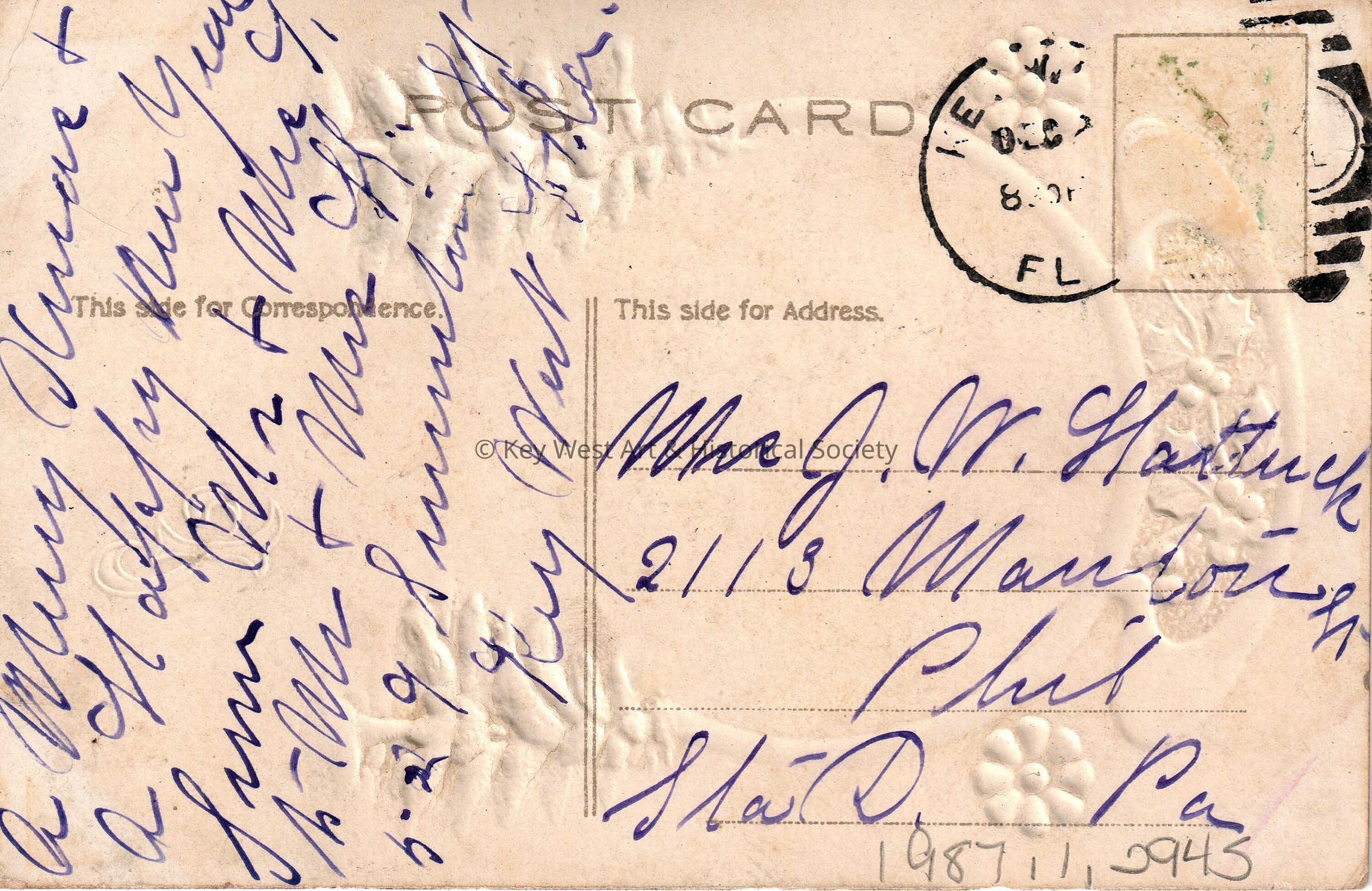 Postcard depicting holly leaves over a snow-covered house and pump. The caption reads, ‘Hearty Christmas Wishes’. The message on the verso reads, ‘A Merry Christmas and a Happy New Year from Mr. & Mrs. T. to Mr. and Mrs. H., 529 Simonton Street, Key West, Florida’. The card is addressed to Mrs. J. W. Hattrick, 2113 Manton Street, Station D, Philadelphia, Pennsylvania, and is postmarked Key West, December.Collection