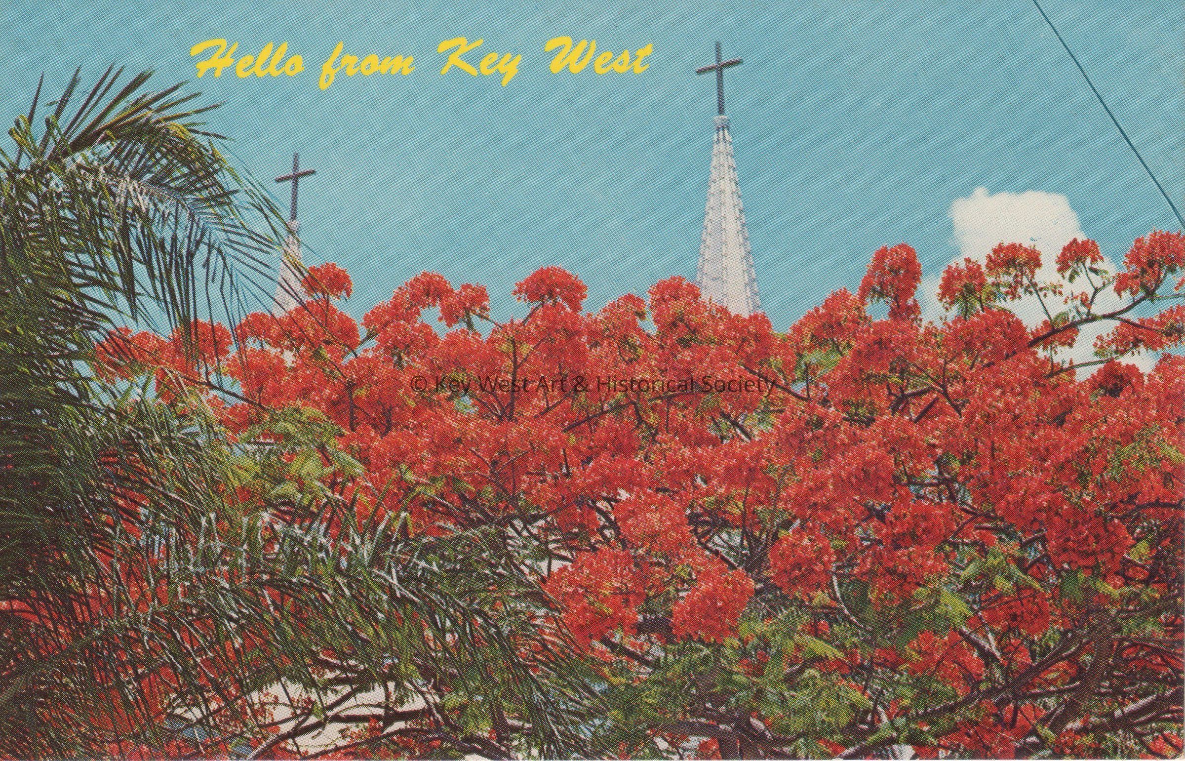 Postcard of a Royal Poinciana tree with spires and crosses in the background, presumably on the grounds of the Basilica of St. Mary Star of the Sea Church. The caption reads, ‘Hello from Key West’. Notation on verso, ‘Key West, Florida is the southernmost city in the United States. It is located almost at the end of the Florida Keys, and is the second oldest city in Florida. The Royal Poinciana Tree shown here is common in this city.’Collection