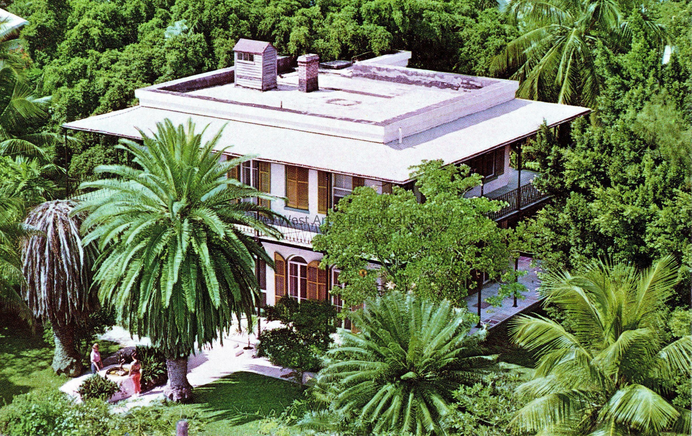 Postcard depicting aerial view of the Hemingway Home. Notation on verso, 'The Ernest Hemingway Home and Museum, Key West. Pulitzer Prize Winner Ernest Hemingway lived in this beautiful Key West Colonial Home during many of his early years of writing. Set in a lush tropical setting of foliage the home is now open to the public and contains many mementos of the famous author at 909 Whitehead Street.'Subject Person/Organization