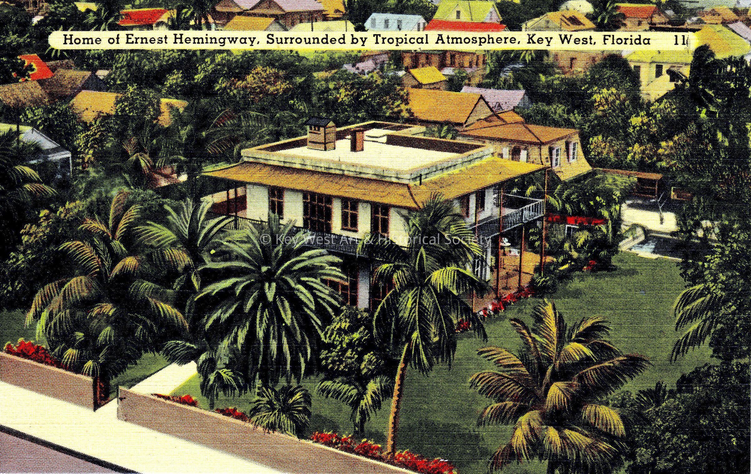 Postcard depicting an aerial view of a house. The caption reads, ‘Home of Ernest Hemingway, surrounded by tropical atmosphere, Key West, Florida’. The description on the verso reads, 'Across Whitehead Street from the lighthouse is the home of the author, war correspondent and big fish angler, Ernest Hemingway.'Collection