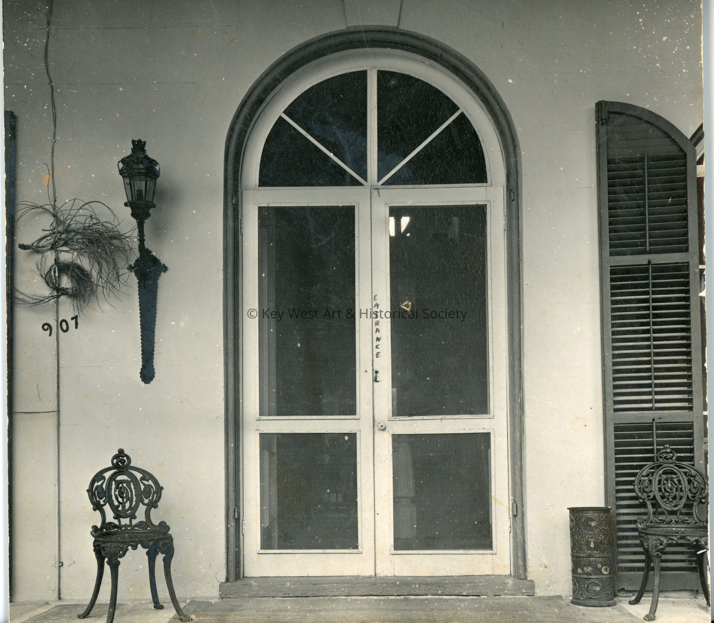 Black and white photograph of the entrance to the Ernest Hemingway Home and Museum. The house is located at 907 Whitehead Street.Photograph Details