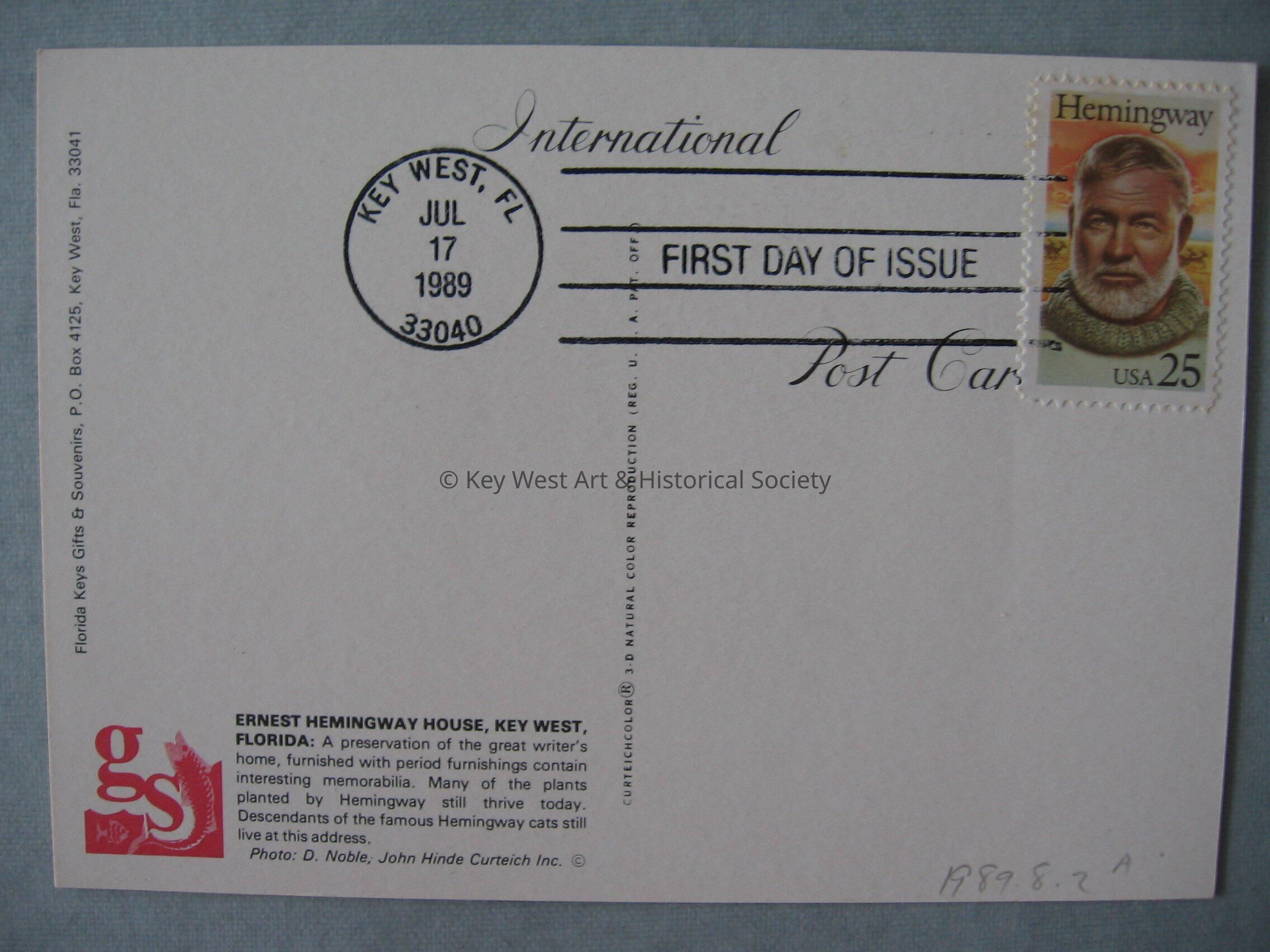 First day of issue of a United States Postal Service Ernest Hemingway stamp on Hemingway House postcard. Cancelled on July 17, 1989. Notation on verso, 'Ernest Hemingway House, Key West Florida: A preservation of the great writer's home, furnished with period furnishings contain interesting memorabilia. Many of the plants planted by Hemingway still thrive today. Descendants of the famous Hemingway cat still live at this address.'Subject Place